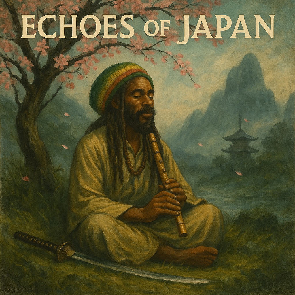 A mystical Nyabinghi reggae song infused with traditional Japanese instruments, Deep roots reggae drums and soft hand percussion blend with haunting taiko drums, hichiriki flute melodies, and the distant chime of the kane bell, The vocal is in Jamaican patois with a calm, spiritual tone, reflecting on ancestral spirits, samurai honor, cherry blossoms, and historical sorrow, The song carries emotional depth, meditative rhythms, and layered instrumentation, like bowed strings, bamboo flute, and subtle ambient textures, Sounds of wind and mountain temples flow through the mix, Echo effects and whispered chants enhance the mystical feel, Think "Burning Spear meets ancient Kyoto, " Meditative, emotional, and cinematic
