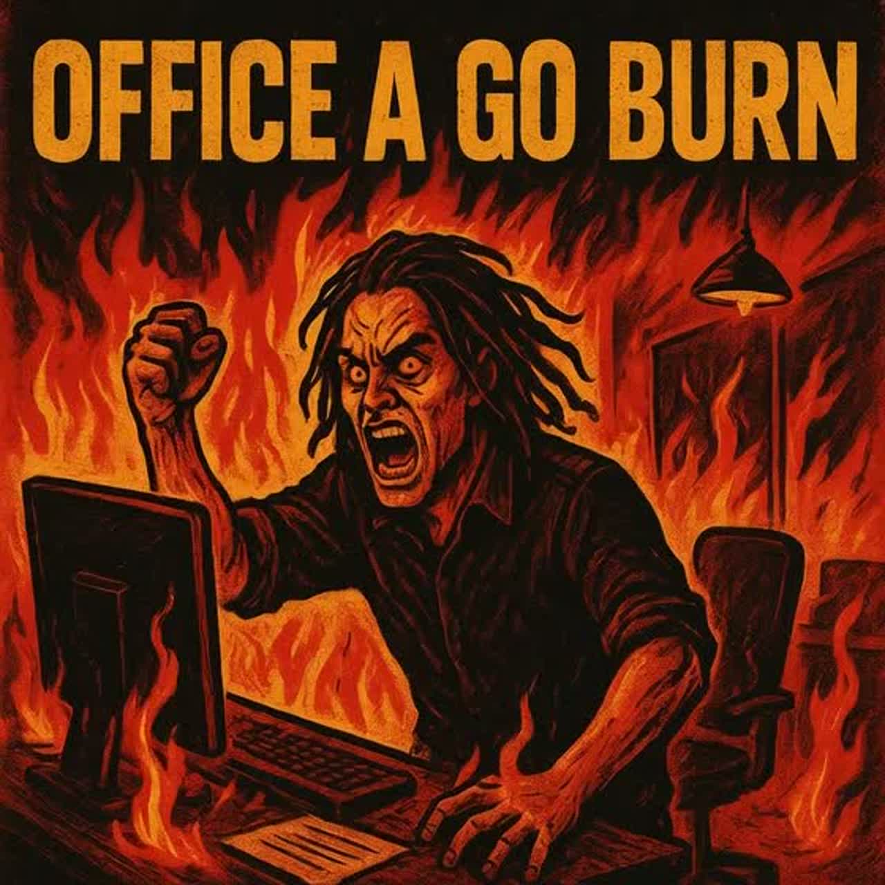 Jamaican patois nu metal rage anthem about burning down the office, Heavy down-tuned riffs, dub sirens, psychedelic delays, aggressive rap verses in patois, massive screamed gang chorus, dubstep meets Lee Perry dub, Printer jams, fire alarms, corporate hell, Drop D minor, 90-95 bpm with huge drops, Insane, violent, cathartic workplace revenge song