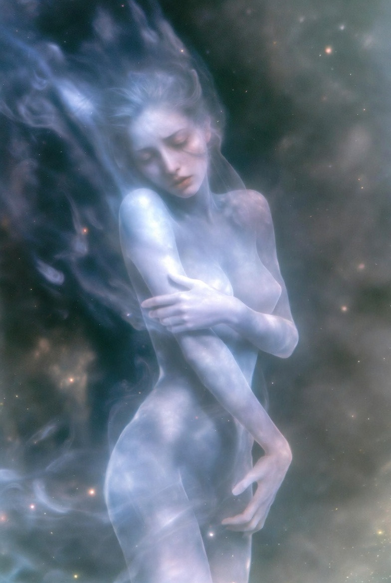 A mystical cinematic track with deep Chinese spiritual atmosphere and cosmic spatial depth, Female Peking Opera (Jingju) vocal style, high-pitched, piercing yet ethereal, alternating between sustained melismatic singing and whispered recitative, expressive vibrato, dramatic breath control, ritual-like delivery, Instrumentation: guqin harmonics, jinghu with slight pitch instability, xiao bamboo flute breath tones, cloud gongs and ancient bells with long decaying reverb, minimal low-frequency drone acting like a gravitational field, No modern pop instruments