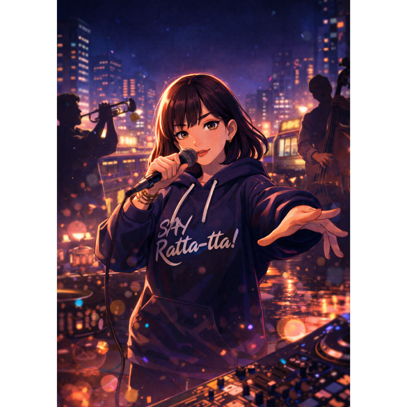 [Style: Hyperpop, Electro Swing, Hysteric Hyperpop meets Rapidfire Scat, Raw band (acoustic/electric guitars, bass, drums) collides with futuristic electronics (synths, sub-bass, samples, brass), Effortless female vocals (JP/EN mix), melodic, scat, rap, ]