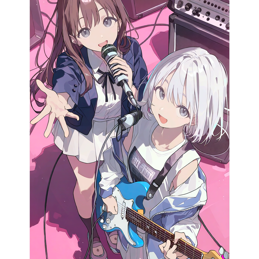 Two girls vocal, rap and melody, live stage track, kawaii female vocal, guitar, bass guitar, drums, slap bass, girl's band play, J-Pop, J-Rock, Bright Pop Club, Hyper-Cute Bounce, Bubbly & Playful, Sugar Pop Trap