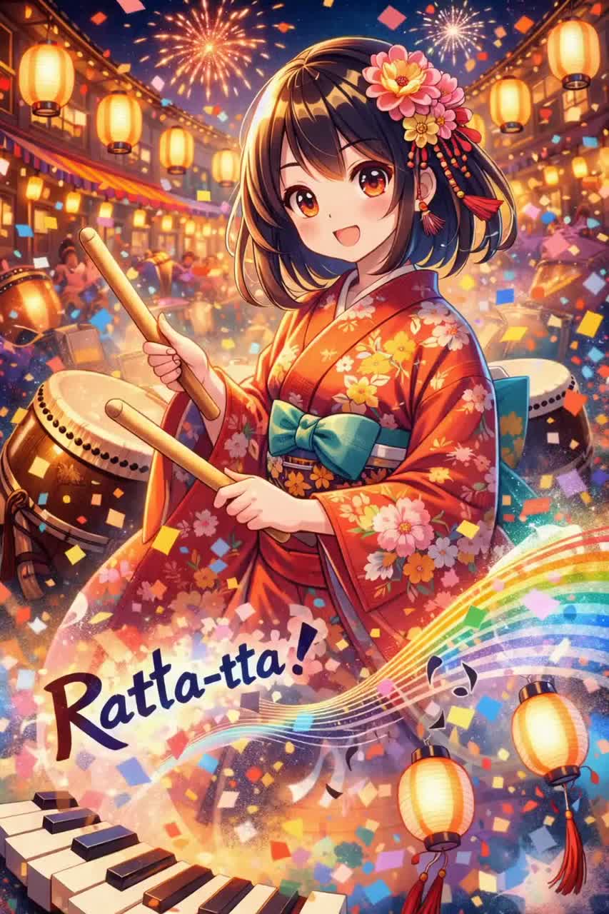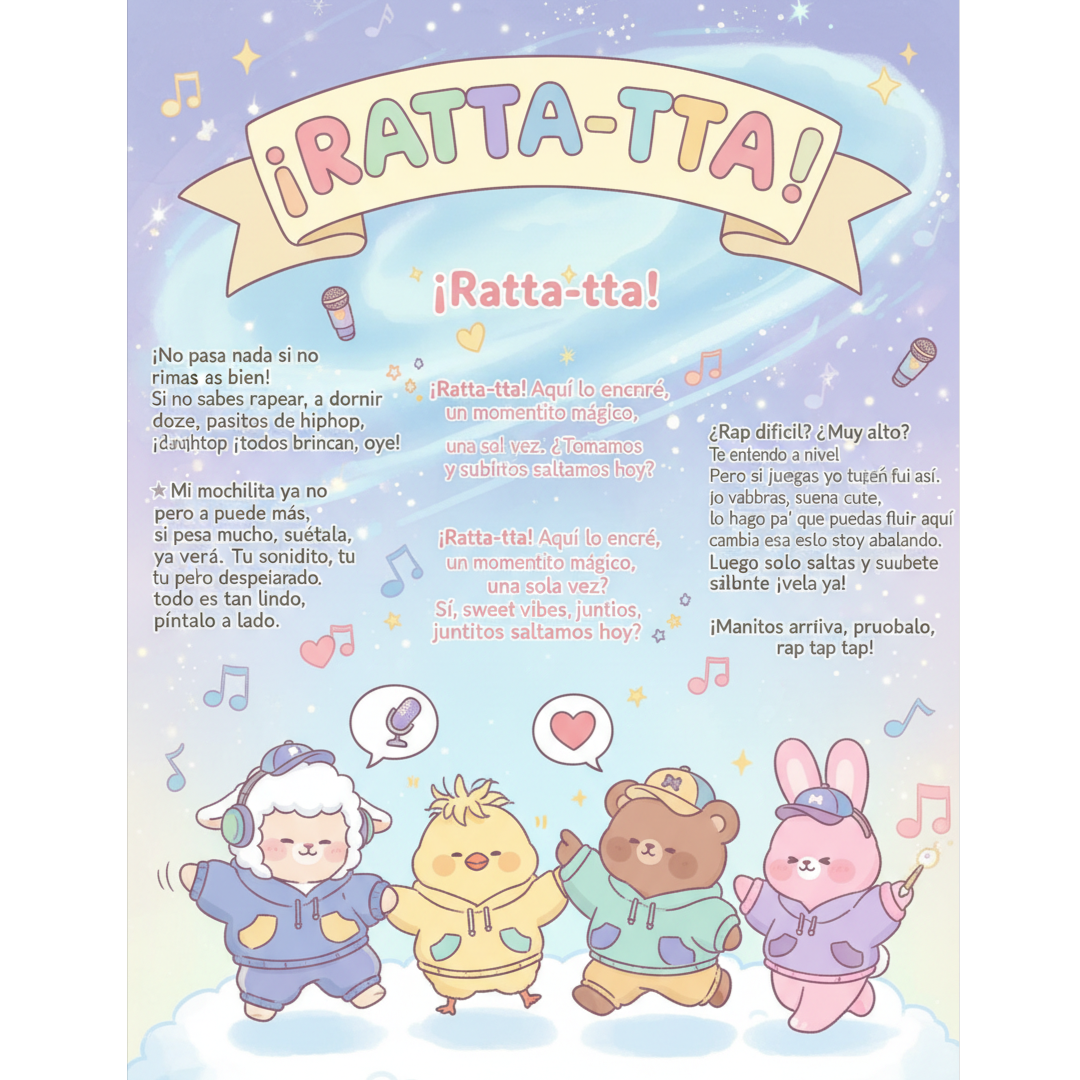 Kawaii Jersey Club × J-Pop Idol × Magical Girl Rap Bounce, soft airy Japanese rap + energetic female group cheers + ratta-tta chops, 135 BPM triplet kicks → 150 BPM frenzy surge, shiny arpeggio bells + pastel plucks + wobbly sub bass, sidechain bounce pads + bubble FX claps + taiko rolls, C Lydian candy hooks, 1, 5s club sparkle reverb, flirty rap tease → triumphant beam drop, cute whisper edge vocals + call-response good vibes, hyper-cute playful mix, ‑male vocals, ‑robotic tone, ‑childish squeak, ‑dark mood, ‑horror vibe, ‑heavy distortion, ‑muddy bass, ‑shrill highs, ‑overcompression, ‑autotune artifact, ‑harsh reverb, ‑lo-fi grit, ‑trap hats, ‑EDM supersaws, ‑uneven tempo, ‑chaotic panning, ‑sibilance, ‑clipping, ‑dull drums, ‑lifeless pads, ‑crowd noise, ‑glitch effects, ‑metallic cymbals, ‑low-quality mix