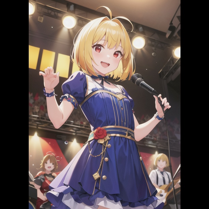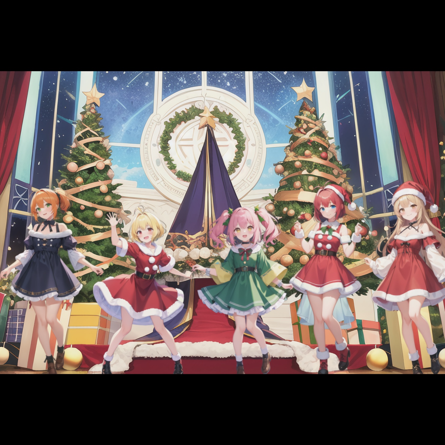 J-pop, cute, idol, female vocals, 5 members, energetic, kawaii, upbeat, anniversary, character voices, solo parts, A sparkly J-pop idol song with five distinct female vocalists, each with her own perso