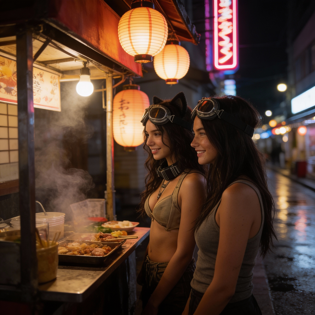 Cinematic Japanese folk metalcore song, target length 3:45–4:10, clear evolving arrangement with contrast, Intro instrumental with koto, ambient pads, light city atmosphere, Verse 1 minimal folk: koto, shamisen, single female vocal, Verse 2 adds soft taiko rhythm, bass, second female vocal, Chorus warm and wide with vocal harmonies and subtle metalcore texture, Instrumental bridge focused on koto and shamisen interplay with soft vocal hums, no screams, no aggression, emotional intensity only, two female melodic voices with distinct timbres, peaceful cyberpunk night market mood, intimate, sensory, alive