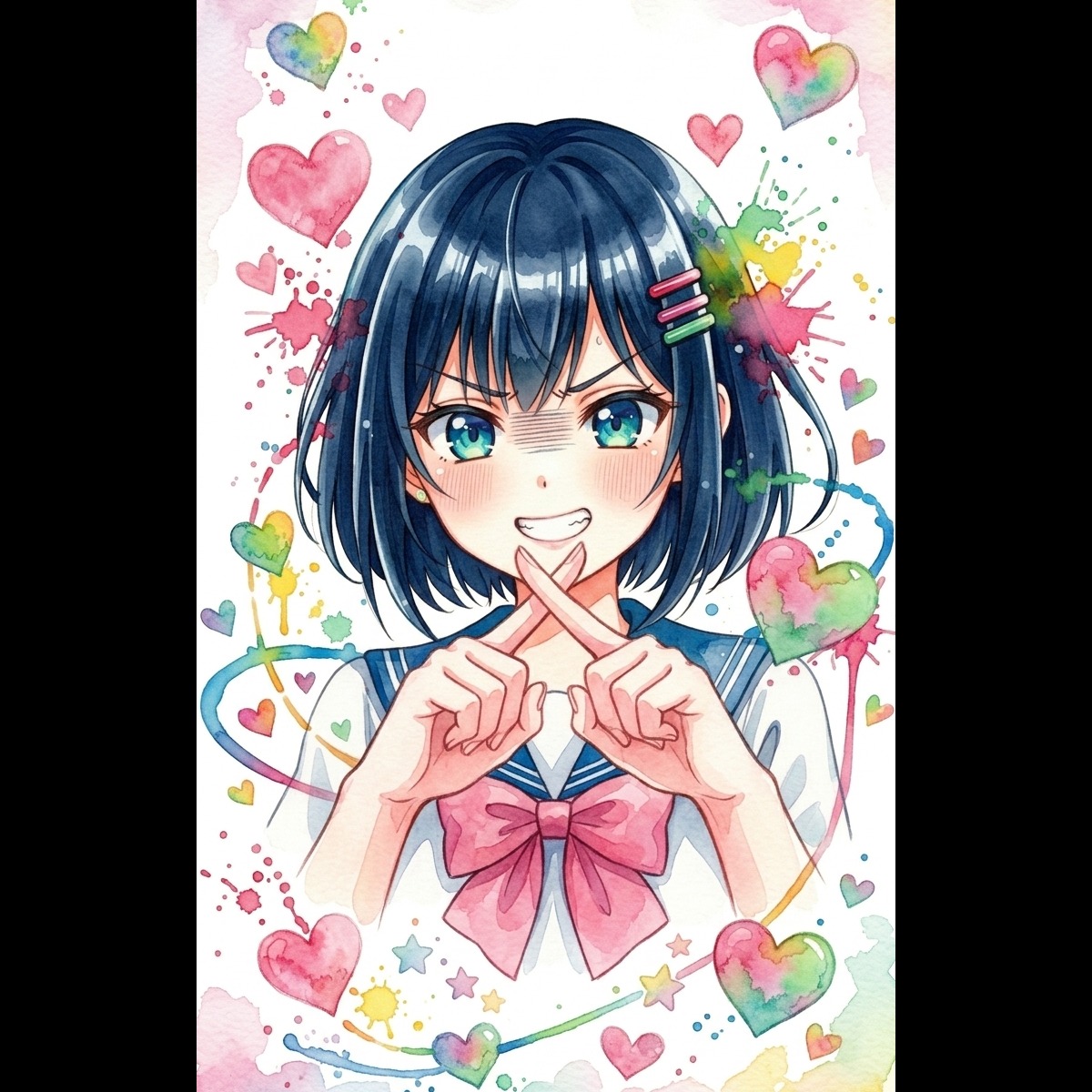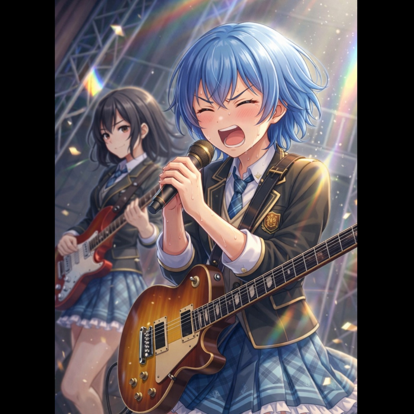 japanese female vocal duet, cute high-pitched female voice and slightly husky female voice, alternating female vocals, call and response vocals, emotional vocal clashes, female japanese indie rock band, high school band energy, youthful emotional rock, emotional japanese indie rock, garage rock band sound, slightly uptempo melancholic rock, clean studio recording, clear vocal mix, focused lead vocals, no crowd noise, no audience sounds, electric guitar distortion, tight guitar riffs, bass guitar, tight rock drums, clean rhythm, duet chorus harmony, layered female harmonies in chorus, emotional powerful final chorus, wide and open chorus, uplifting emotional peak, controlled emotional vocals, no aggressive screaming, balanced mix, polished but still slightly raw indie feel