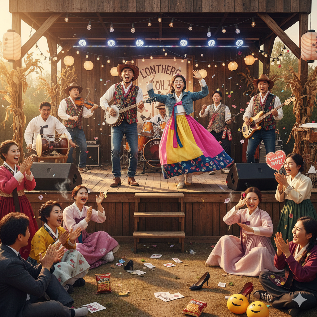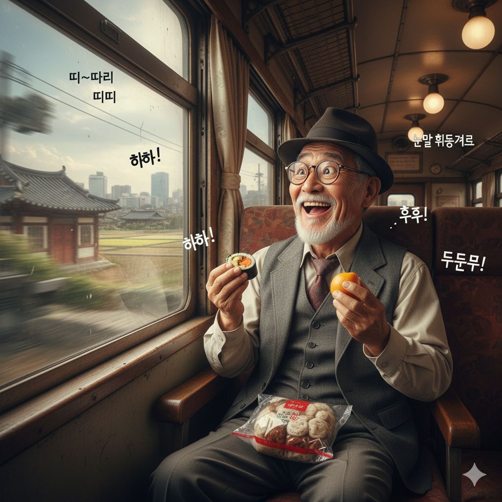 [High-energy, fast tempo, playful Korean folk/trot storytelling song, Acoustic instruments including guitar, banjo, harmonica, accordion, violin, upright bass, and soft piano, Brush snare and percussive handclaps for maximum groove, Lively, comedic tone with expressive male vocal, Rhythmically designed for maximum swing and syncopation, with repetitive hooks "띠~따리 띠띠, 하하! 후후!" and "눈알 휘둥그래" to enhance danceable feel, Add detailed instrumental layers: harmonica flutter, violin stabs, banjo plucks, accordion fills, Incorporate subtle ambient train and city FX, Build cinematic folk narrative with tempo variation: slow intro, rhythmic expansion, comic climax, and gentle outro, Highest audio fidelity, clean stereo, dynamic expressiveness, clear transient definition, Vocal storytelling with rhythmic phrasing, expressive ad-libs, natural warmth, Output 7-minute full-length track with energetic hooks and playful, rhythmic laugh FX, ]