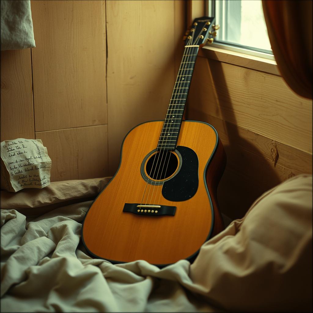 features a minimal guitar harmonic phrase with faint field noise, The bridge breaks form — nearly spoken — over a swelling low drone before resolving in a final, fragile verse, Ends with the sound of wind through leaves, the guitar fading like memory, Feels like a forgotten home video playing in reverse — delicate, human, and ghostly, ‑tape hiss