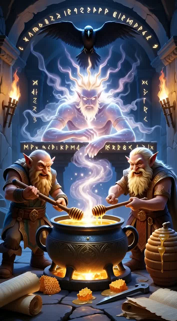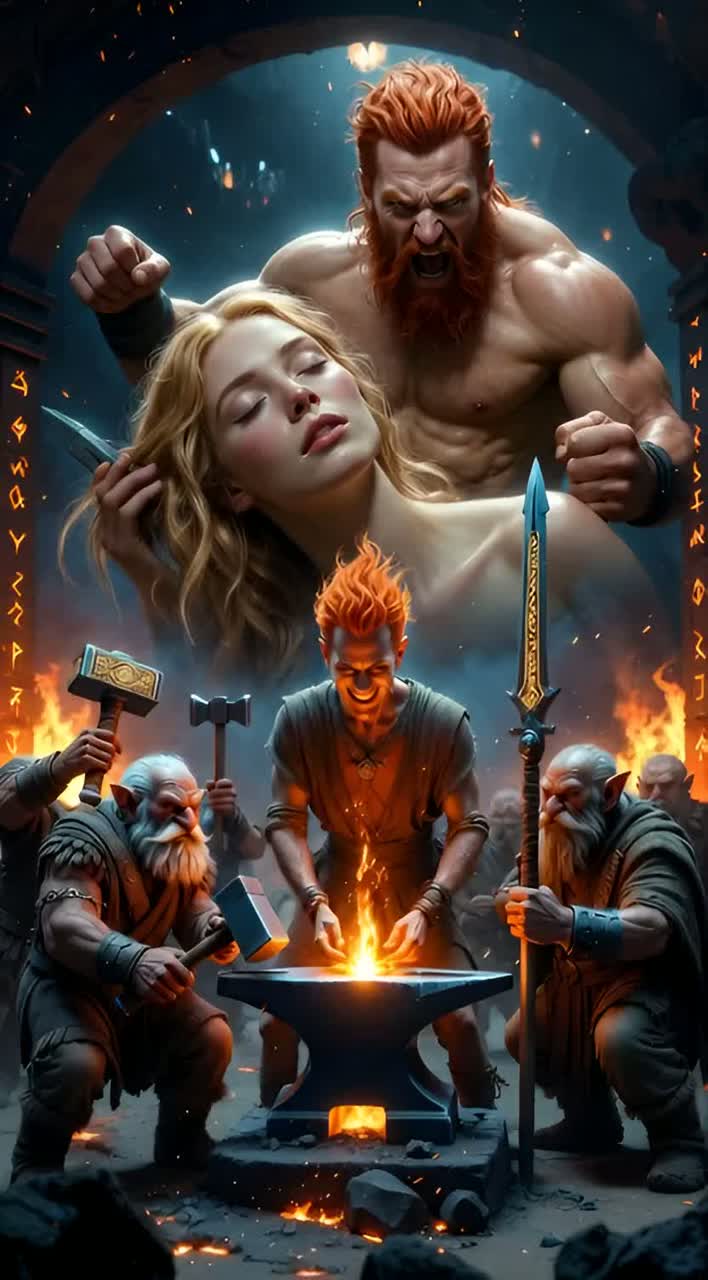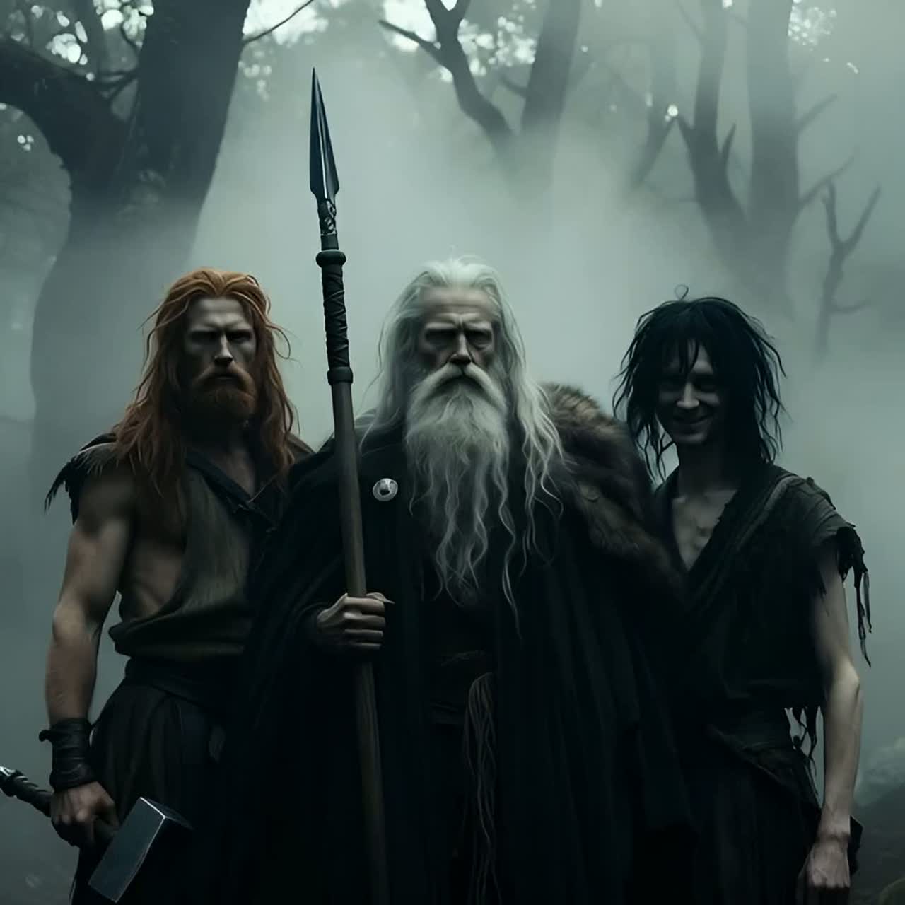 Raw Nordic folk saga with male vocals, low throat-sung drones, tagelharpa and lyre leading, Bones and stones as hand percussion, crackling fire and water sloshes woven into the rhythm, Verses stay close and chanting; chorus opens into a wide, call-and-response war cry, Final section grows darker and faster as Sleipnir is born, hooves implied by booming frame drum, musical