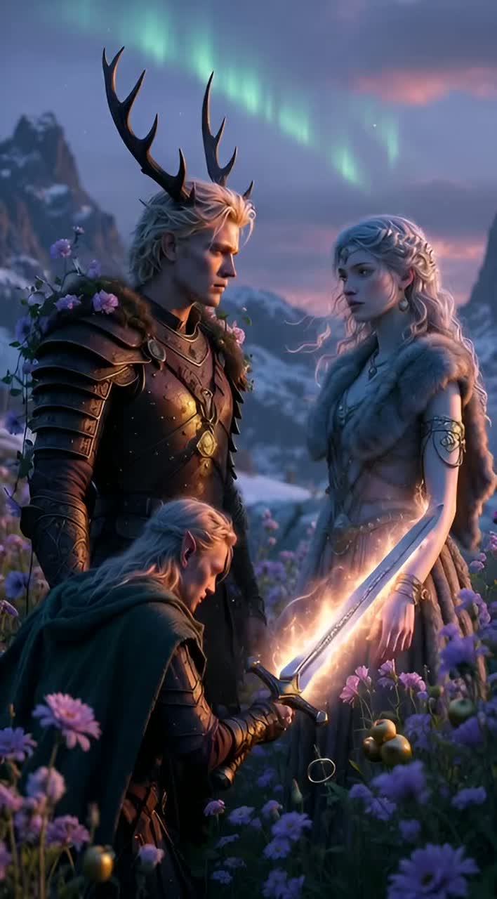 folk, Nu-metal meets epic Norse score: dropped-tuned guitars and tom-heavy war drums, layered with choirs and haunting Nordic drones, Verses float on sparse, icy soundscapes and pulsing bass; choruses explode with double-tracked male and female vocals, roaring guitars, and massive gang shouts, Bridge leans into atmospheric strings and low chants before a final, towering finale, Male and female vocals, magical, beautiful, metal