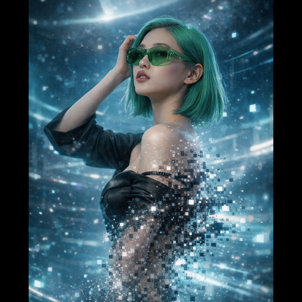 Style: Experimental fractal electronica, glitch-soul, IDM-pop, Tempo: Elastic 0–∞ BPM, recursive morphing, Groove: Polyrhythmic jitter, liquid micro-timing, heavy sidechain pump, Drums: Granular clicks, spectral wood-snaps, sub-atomic 808 blooms, Bass: Gliding sub-fractals, non-Euclidean bends, recursive FM growl, Vocals: Female, husky, ultra-dry close-mic, vocoder ghosts, Delivery: Minimalist phrasing, beat-dragging verses, soaring head-voice sustains, Arrangement: Long-form instrumental evolution with sparse vocal anchors, Keys: Granular Rhodes, fractal arps, bioluminescent pads, Stereo: Hyper-wide, holographic motion, recursive echoes, Production: Glass-clear fidelity, quantum noise floor, tape-warmed vocals, Mix: Vocals embedded in glitch, high-contrast stacking, Dynamics: Extreme expansion, micro-silences, sudden sub-bass drops, Mood: Ethereal, dissociative, mathematically beautiful, Energy: Restrained violence dissolving into transcendent cool, Quality: Ultra-HD, ‑humming