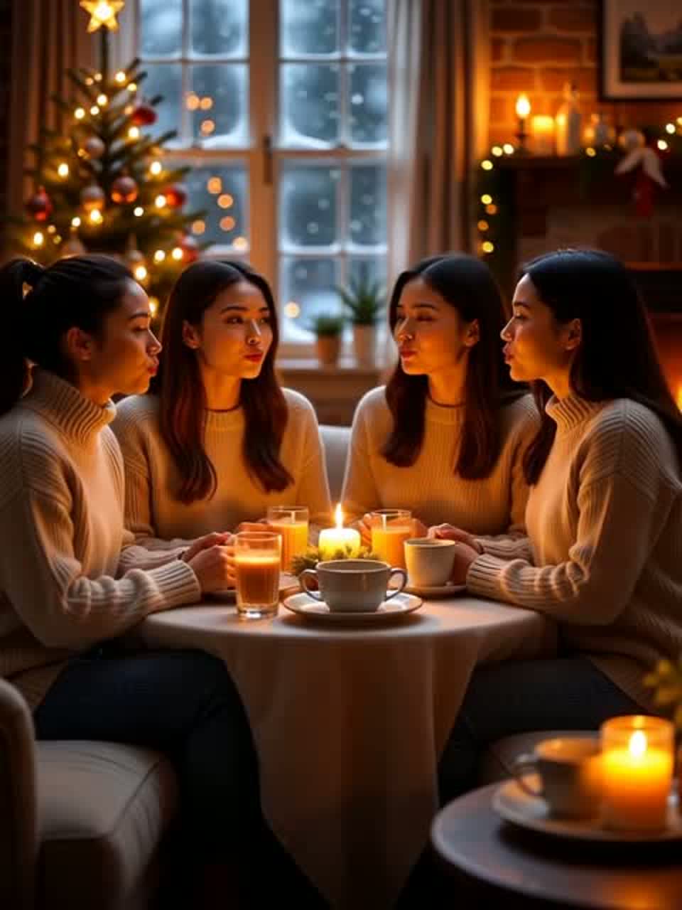 Smooth Jazz Christmas, R&B, Vocal Performance, Vocal Band, All sounds are voice-generated, produced entirely by voices, no synths, no pads, no guitars, Slow tempo, A warm, mellow, and nostalgic slow tempo vocal performance, evoking the traditional American Christmas hearth scene, Features a mixed a cappella sextet (3 female voices, 3 male voices), The arrangement emphasizes smooth jazz harmonies with rich, layered backing vocals using scat and harmony, Deep, resonant bass (Male 2) and precise beatboxing (Male 3) create a stable, sophisticated rhythmic foundation, not singing melody, Lead vocals (Female 1) are soothing and romantic, supported by the complex vocal arrangement, The mood shifts from calm reflection and nostalgia in the verses to euphoric joy in the choruses, celebrating the comfort and bond of family during the holidays, The music aims to convey deep happiness and tranquil serenity, capturing the essential spirit of a classic Christmas standard with a sophisticat, ‑Synthesizer, ‑strings, ‑FX sounds, ‑pad, ‑guitars, ‑electric guitar, ‑trumpet, ‑sax, ‑piano, ‑organ, ‑harp, ‑keyboard, ‑drum machine