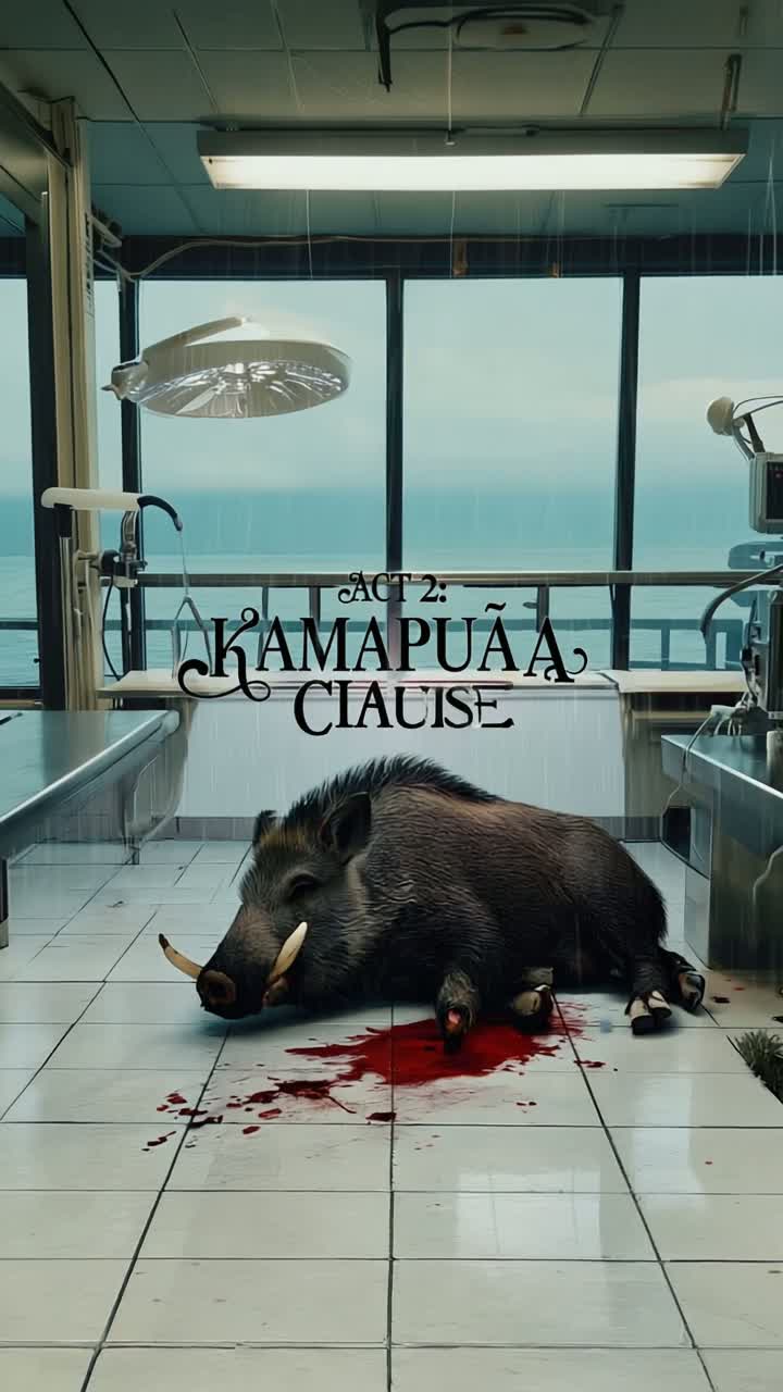 Hawaiian Hip-Hop with horror undertones, heavily infused with surf rock, Lead vocals are masculine with a laid-back West Coast flow to simulate Pidgin, Traditional Hawiian instruments are incorporated for ornamental effect, Baritone surf rock guitar drives the track: clean and reverb-heavy at the start, then distorted and aggressive by the bridge, It drops out completely after the collapse, Bassline is 808 and west coast surf rock driven and evolves from lo-fi and sparse to mythic and percussive, then fades near the end, Percussion begins minimal (rim taps, breath loops), then layers distorted snares and surf-style tom rolls, The overall tone is glossy at the start, retributive and mythic in the middle, and quiet and sparse near the end
