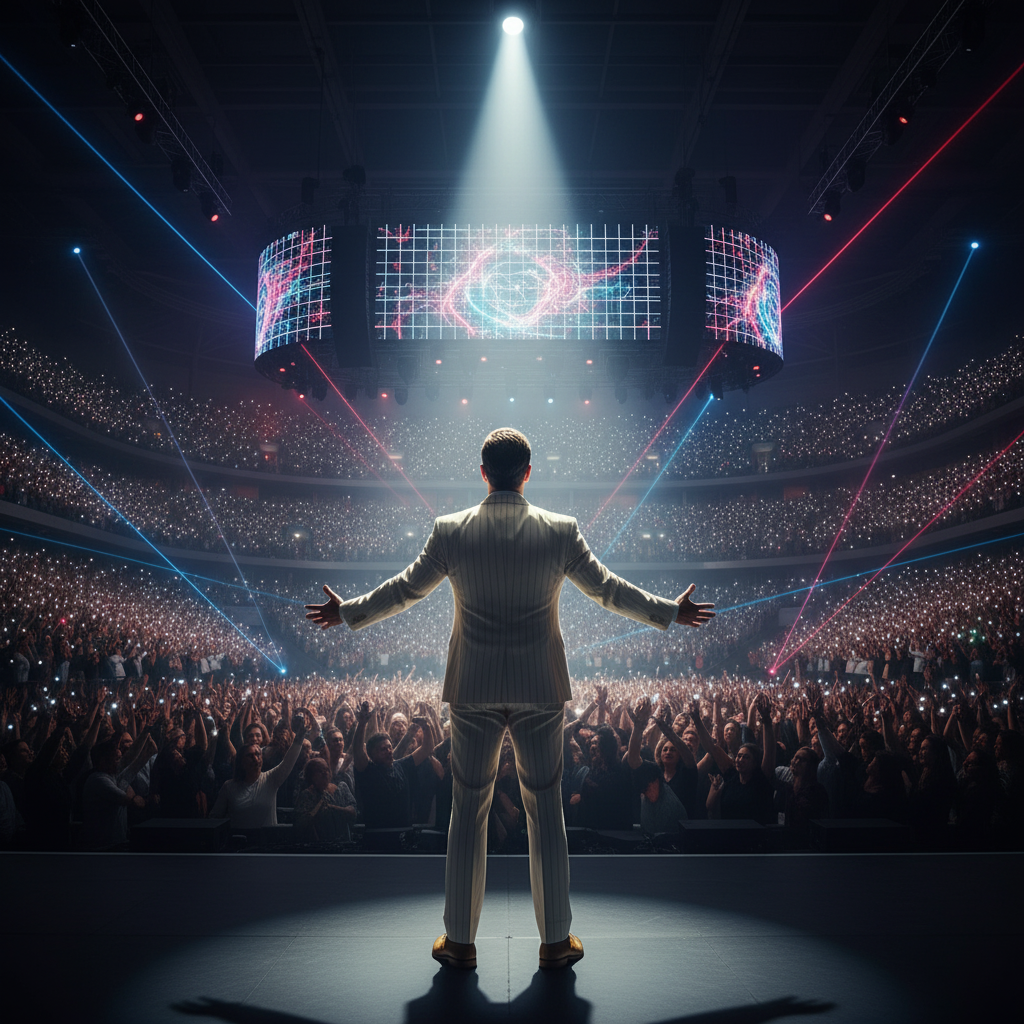 Modern arena rock anthem, 126 BPM, powerful punchy drums, driving bass, tight distorted electric guitars, stadium claps, massive crowd chants in choruses, deep confident male lead vocal, occasional spoken declarations, dynamic build-ups, explosive instrumental sections with guitar solo, brass hits for grandeur, subtle corporate synth textures, strong breakdown section with minimal drums and bass, high dynamic contrast, studio intro gradually evolving into full live arena climax, controlled modern production, epic but tight mix