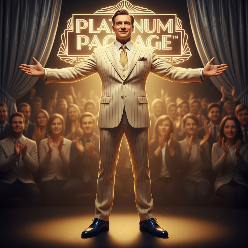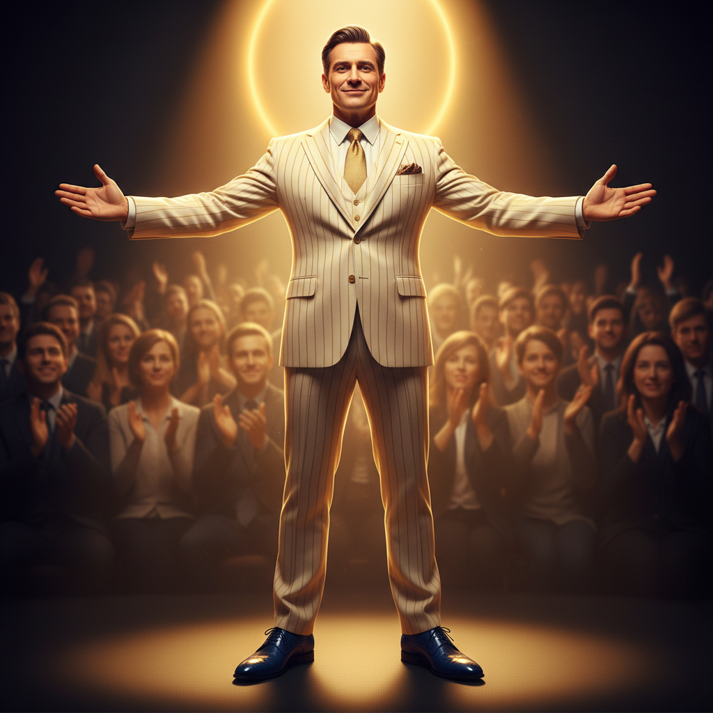 Energetic funk cabaret, satirical comedy rock, male lead vocalist with confident, theatrical flair, speaking and singing, Tight drums, deep funky bass, short guitar stabs, warm electric piano, strong brass section, Over-the-top seminar show vibe with humor and charisma, Lead vocal is dominant: self-important, charming, satirical, Choruses are big and catchy with small backing choir, Style is funky, comedic, slightly absurdist, but rhythmically tight, Influences: motivational speaker parody, glam rock attitude, 70s funk