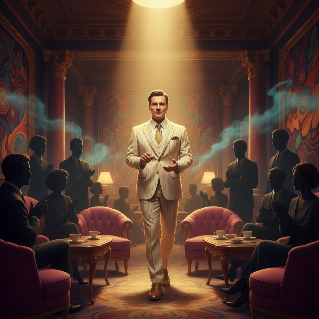 Cinematic cabaret-pop with a manipulative self-help seminar vibe, Warm electric piano, subtle funk bass, controlled drums, light orchestral swells, Spoken/sung delivery from a charismatic, pompous male persona: Sir Cornelius Archibald Sterling, Clear diction, Slight choir accents only, Maintain steady musical pulse in the outro to prevent drift, No long silences, Dramatic pauses allowed but always musically supported