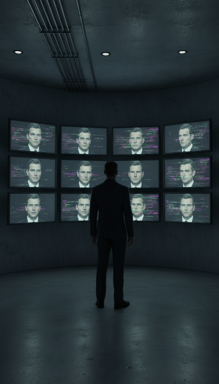 Surveillance ambient, minimalist glitch, ASMR spoken word, paranoid atmosphere, slow cinematic tension, audio corruption effects, repetitive micro-loops, psychological self-observation