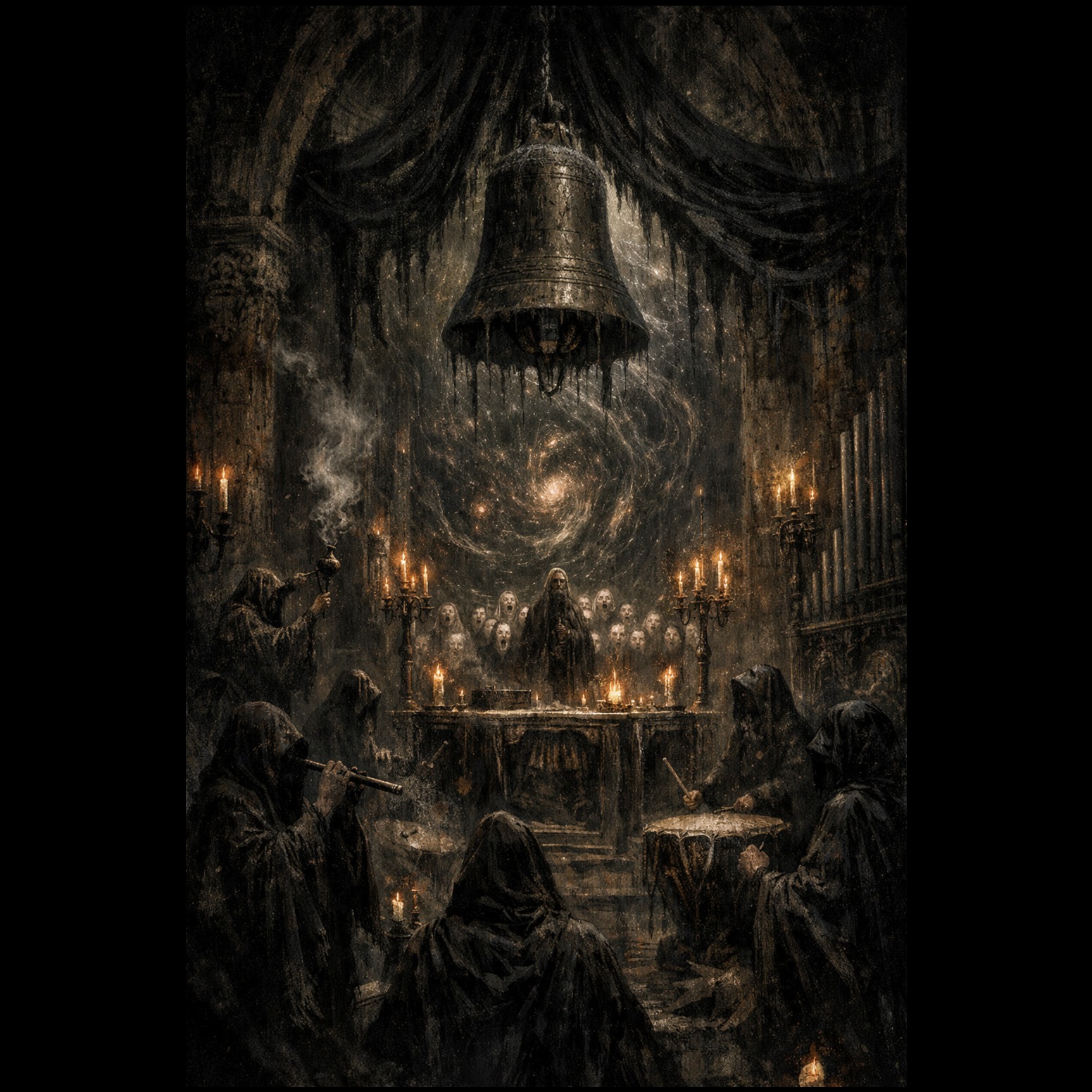 azathoth-core eldritch carol, divine dread horror, choir-dominant;Tempo:168bpm, Meter:3/4(feel12/8), Key:Fm, Bridge:Abm(Eb7);Core:muffled ritual drums nonstop+thin cursed flute monotone(1-2 notes)+diminished-scale shadow;Vocal:mass SATB×5+boys+low male drone, whisper/guttural, detune±45c, constant 2nds/tritone, no pretty vibrato;Choir-Tech:canon entries, antiphonal call-response, cluster stabs, wordless ostinato;Harmony:Phrygian(b2), i<->bII, heavy °7 planing(dim cycles every bar), #i°7 passes, iiø->V7alt->i, clusters(addb9/#11), avoid clean cadences;Ensemble:detuned pipe-organ drone, irregular bells playing °7 arps, low strings sul pont trem, contrabass+sub, rare low-brass stabs;FX:subharm pressure, flutter/tape wobble, reverse swells, near-silence drops then slam;Mix:small claustrophobic chapel, dirty room, sharp consonants upfront, gated+modulated tails;Avoid:major lift, EDM risers, trap hats, lush pop beauty, long outro, overcompression