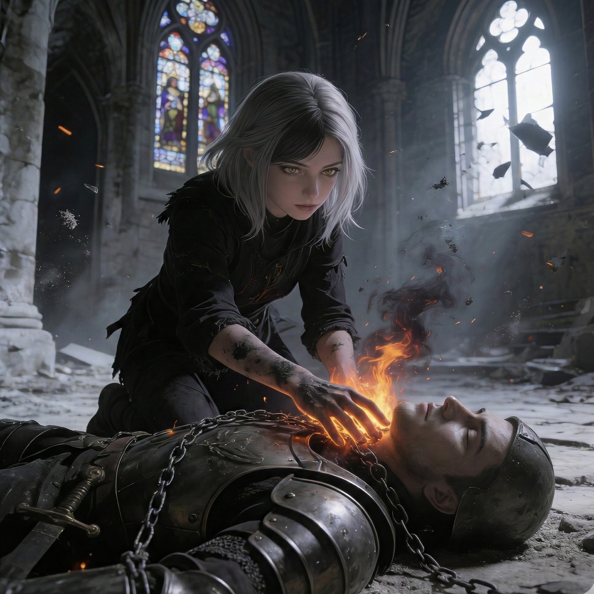 Dark but determined, intense, cinematic, inner flame hidden in shadow, misunderstood yet protective