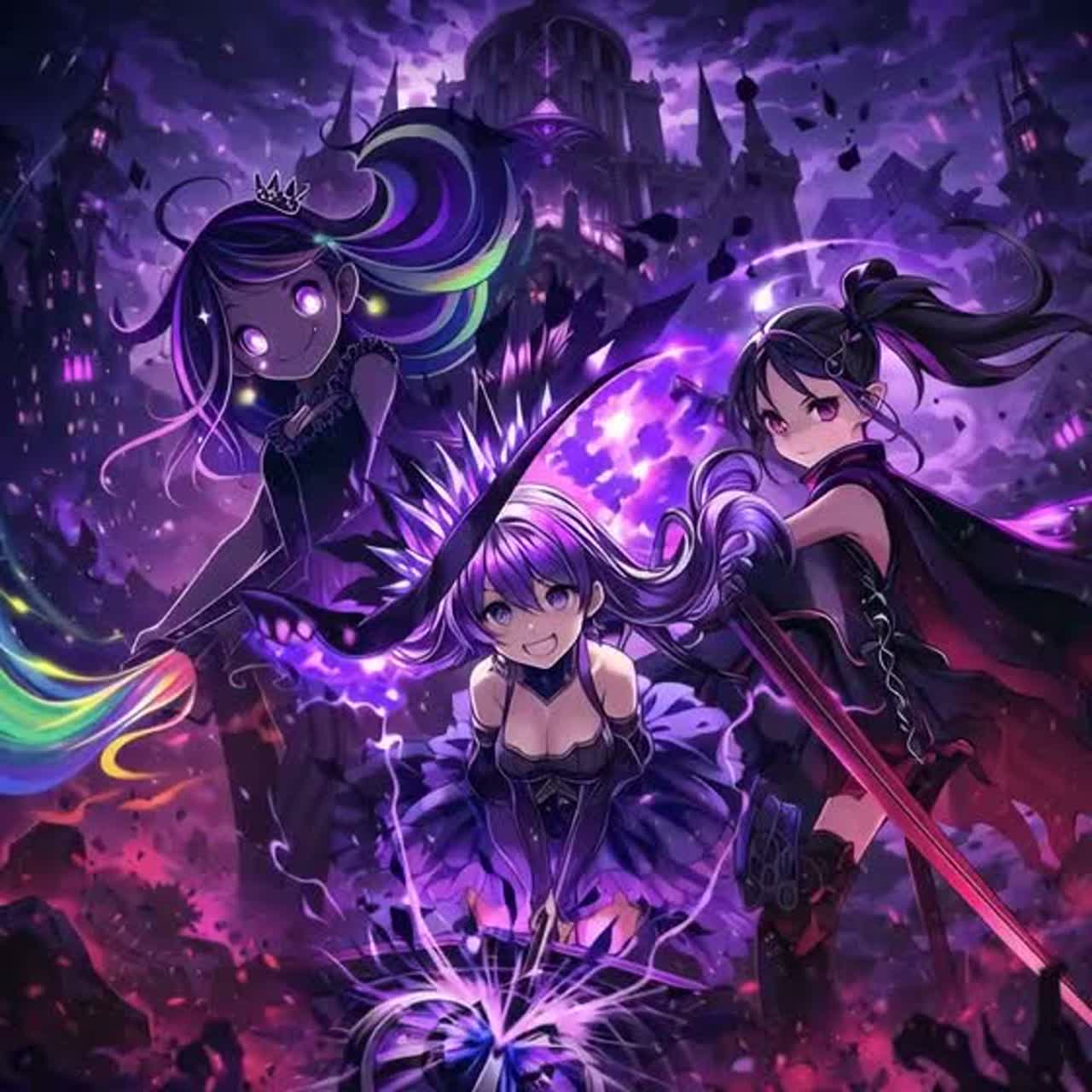 Hyper-energetic avant-garde bass house fused with dark future bass, jungle and drum-and-bass propulsion, and playful electropop sparkle, driven by fast breakbeats, rolling jungle drum patterns, punchy four-on-the-floor impacts, and deep yet bouncy sub-bass, layering jazzy chords with gothic harmonic tension, combining kawaii denpa-core idol vocals, mischievous devil-girl tones, and seductive dark-sorceress whispers in hypnotic call-and-response, blending sparkling synths, chiptune-like leads, whimsical arpeggios, music-box motifs, and magical bell tones with fantasy instruments such as harpsichord, lute, hammered dulcimer, shakuhachi, koto, taiko, pipe organ, and soaring western fantasy strings, enriched by low choir pads and arcane vocal textures, filled with magical sparkle SFX, spell-casting chimes, arcane bells, rainbow-like glowing particles, enchanted brush-stroke sound trails, vinyl scratches, rhythmic drop-outs, plunderphonics-style chopped spell fragments, and subtle human-gli, ‑トリプル・アビス・ラッシュ