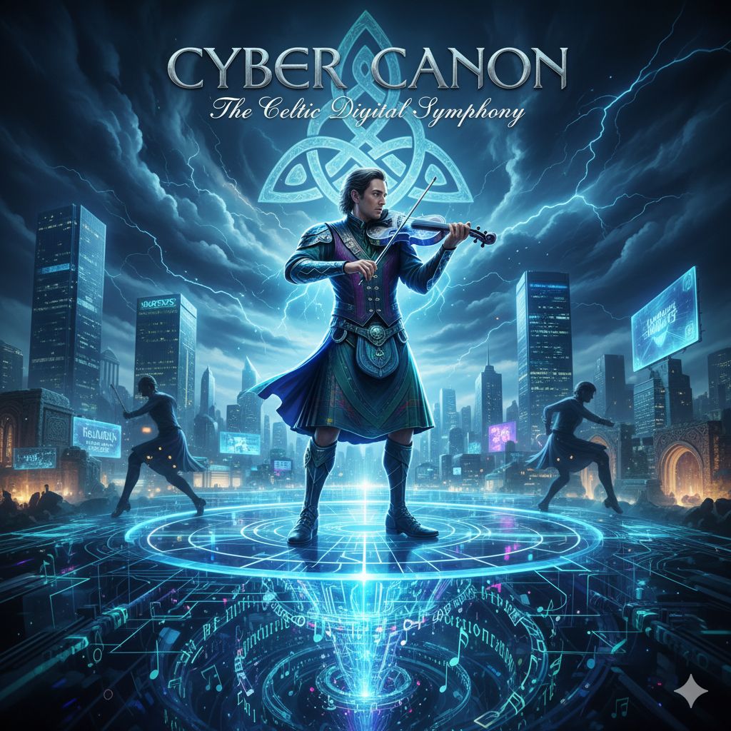 Cyberpunk Irish Folk, Electro Celtic, Pachelbel's Canon Remix, Fast Irish Reel rhythm, 6/8 Jig beat transitions, Electronic Dance Music, Synthesizer Arpeggios, High-energy Fiddle, Tin Whistle, Heavy Techno Bass, Cybernetic atmosphere, 128 BPM