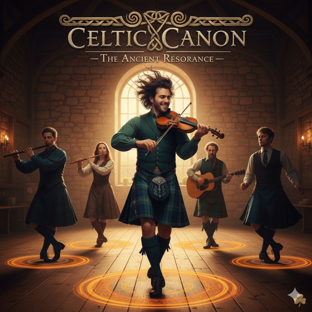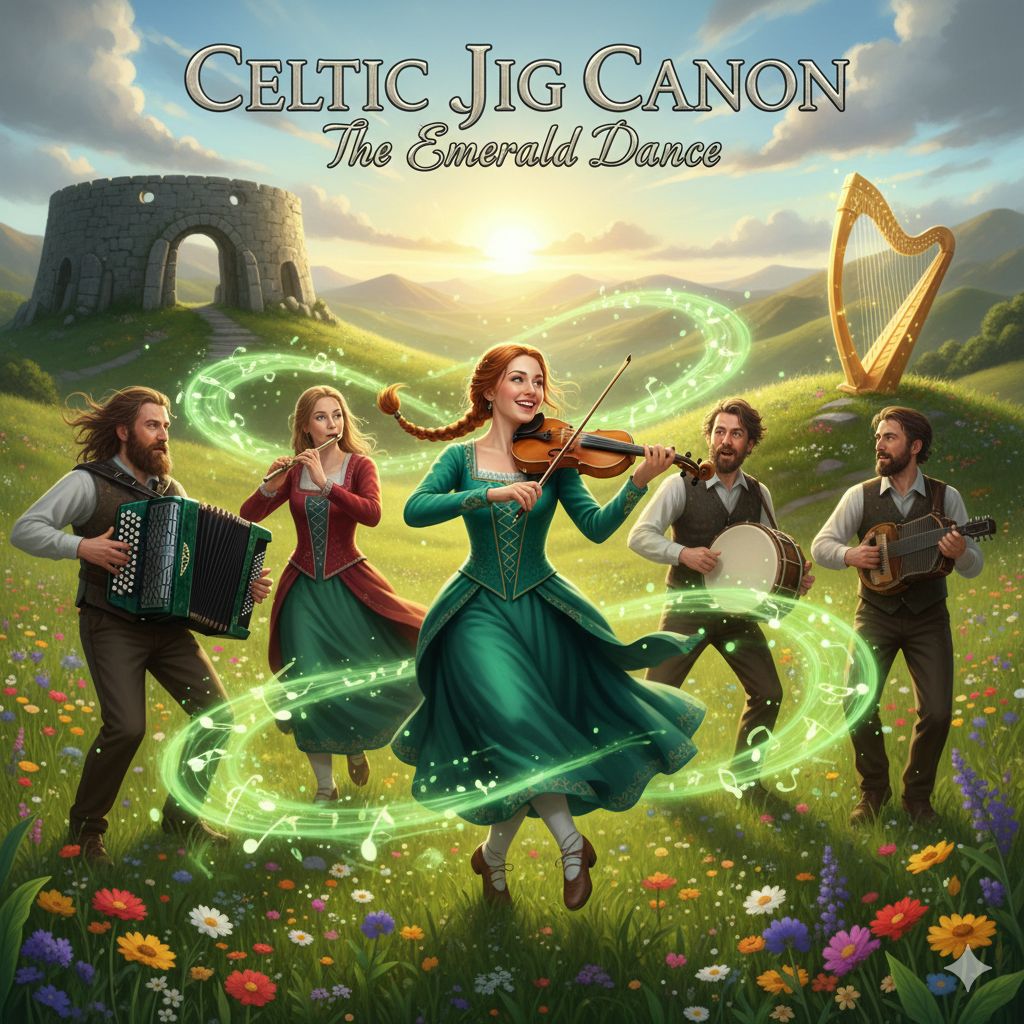 Authentic Irish Jig, 6/8 Time Signature, Pachelbel's Canon in Jig Style, Traditional Celtic Folk, 120BPM, Lively Tin Whistle, Bright Fiddle, Accordion, Celtic Harp, Bodhrán Triplets, Rhythmic Soft-Shoe Step sounds, Airy and Uplifting, Natural Acoustic Resonance, No Vocals