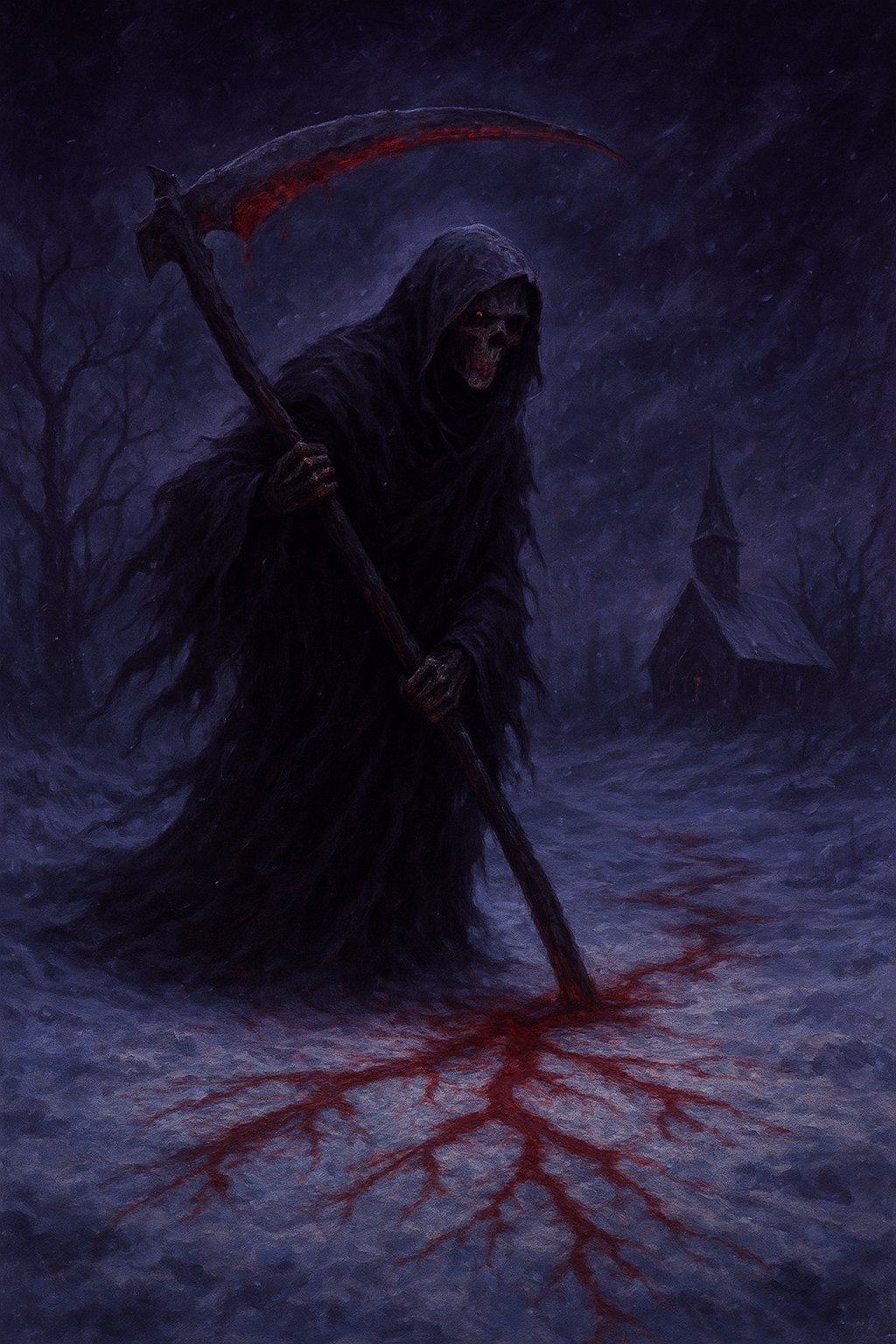 A sorrowful melodic death metal track with icy atmosphere and layered emotion, Dual guitars in [Drop C] weave harmonized riffs and mournful melodies over ambient synths and pulsing drums that shift from steady double-kicks to explosive blasts, Vocals blend deep growls, whispered lines, and distant clean harmonies to reflect a descent into madness, The structure mirrors the fallโbeginning soft and mournful, rising into chaos, then fading into broken silence, Every section bleeds with grief, confusion, and transformation, This is the sound of a warrior losing his soul