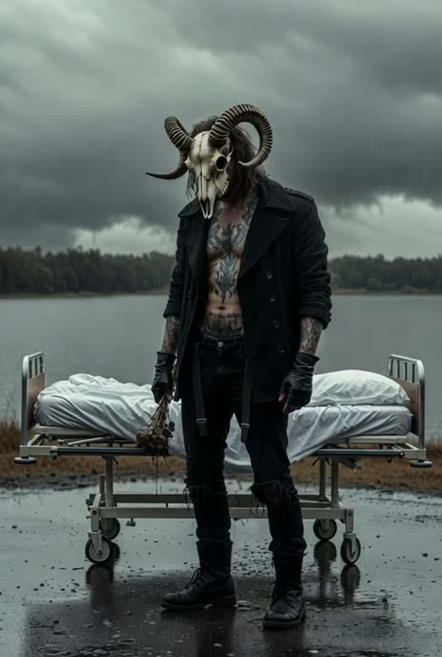 No vocals, Dark atmospheric intro with deep ambient drones, electric violin, and ascending growling bass, Slow ritual drums building into full metal drums, Heavy distorted metal guitars, Drop A# tuning, wide stereo, 808 heavy bass layered with bass guitar for massive low end, Symphonic choir pads, dark brass, and icy reverb swells, Electric violin lead melodies with haunting bends and high-octave runs, Full peak section with intense double-kick, tremolo guitar, and cinematic orchestral hits, Cosmic, huge, emotional, gothic, supernatural energy โ like a supernova behind a moon, Ends with a dramatic atmospheric fade, 8:00 duration, instrumental only