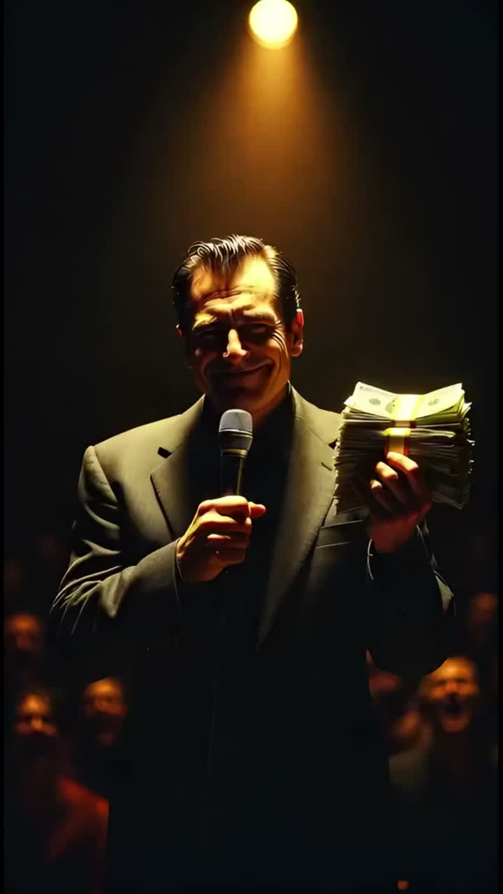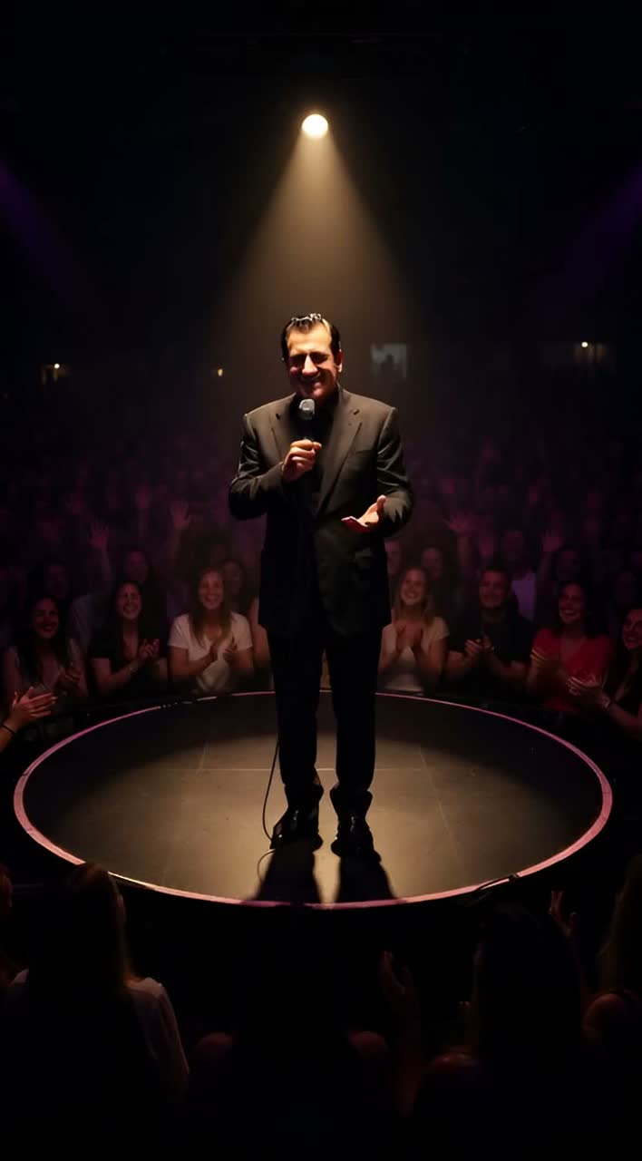 A theatrical cabaret-style performance featuring a baritone male vocalist delivering a spoken-word monologue with dramatic inflection, The musical accompaniment is minimal, consisting primarily of a rhythmic, mid-tempo piano arrangement in a minor key, punctuated by sharp, staccato chords and occasional flourishes, The production captures a live performance atmosphere, complete with prominent audience laughter and applause that serves as a dynamic element of the track, The vocal delivery is expressive and satirical, utilizing varying tempos and volumes to emphasize the comedic narrative, The overall structure is driven by the storytelling, with the piano providing a dark, whimsical backdrop that mimics the timing of a stand-up comedy routine or a theatrical play, The mix is clean, focusing on vocal clarity while maintaining the natural reverb of a live hall