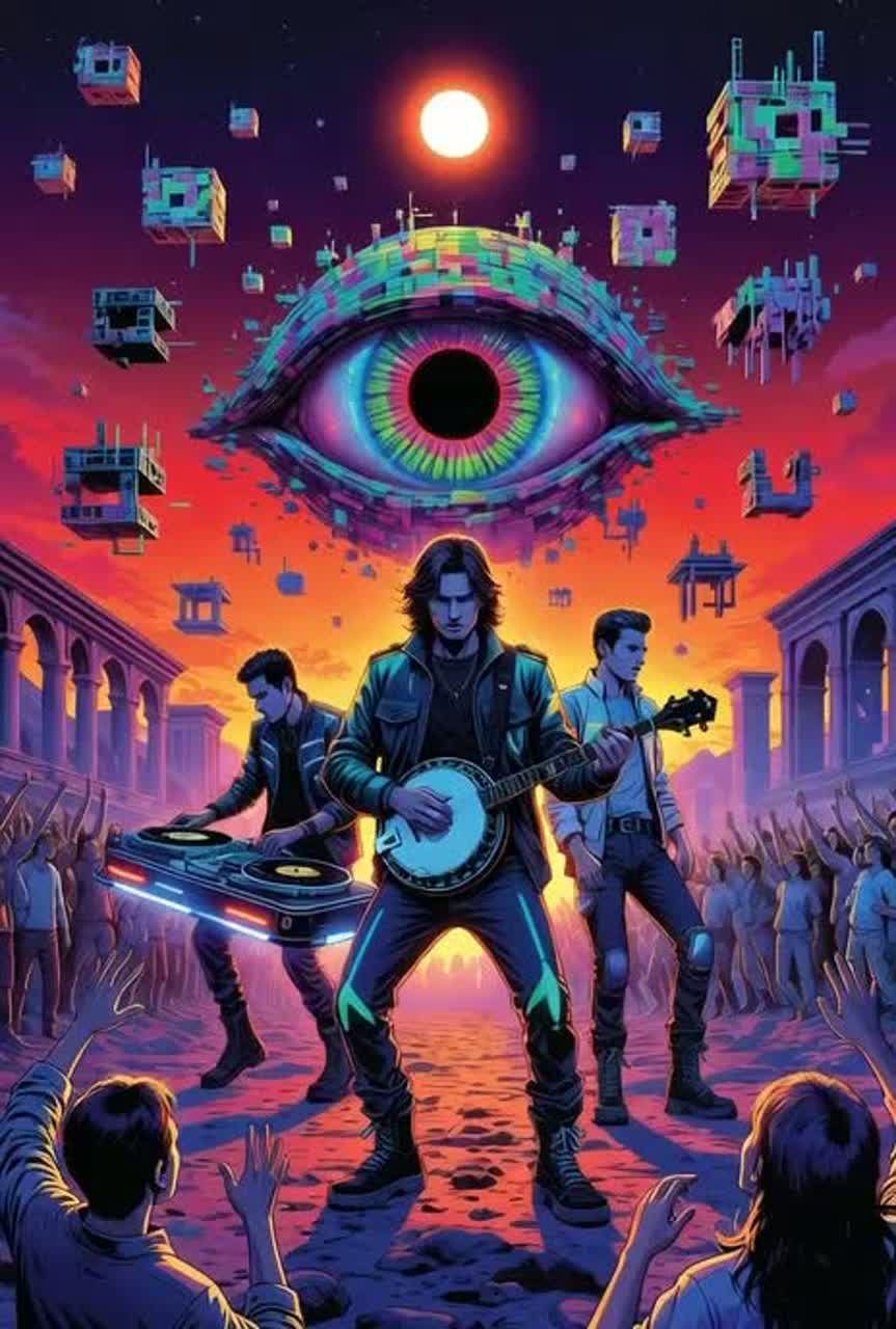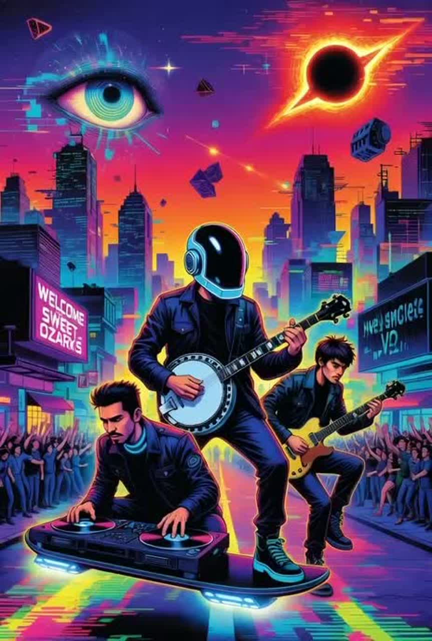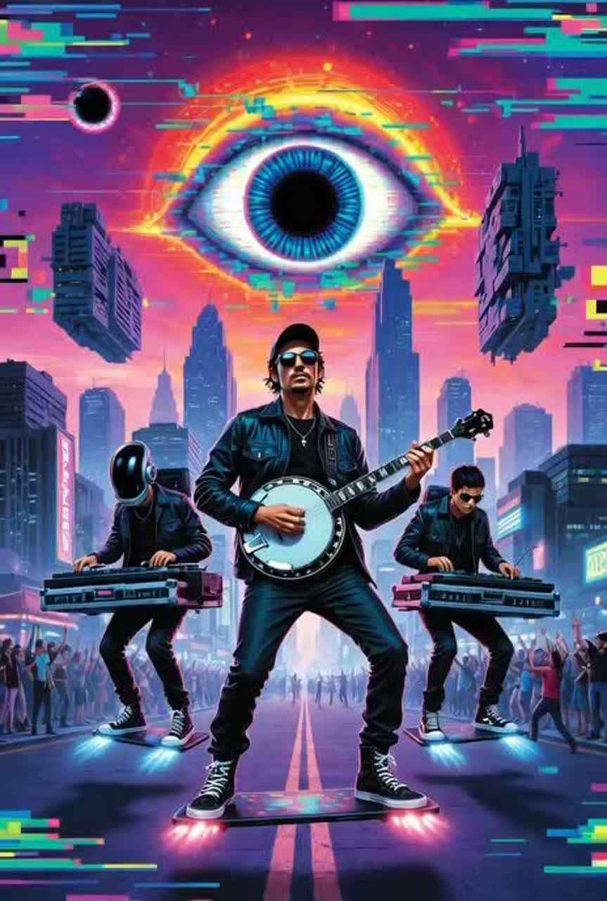Opening with experimental melody fingerpicked acoustic guitar interwoven with folktronica styling, layered softly with analog synth textures, art rock electric guitars blend in for dynamic choruses, Bridge features asymmetrical rhythms, field recordings, and unexpected melodic shifts, closing on a minimal, experimental coda, Vocalist should ahve a somewhat un-traditional male voice but still be clearly male, Dark sexual tension throughout the song Daft Punk’s Funny Disco Futuristic Cyber Punk, Daft Punk’s Vocals, Trippy, Cinematic, Sound Effects, Club Disco, Emo Punk Rap Poser, Experimental, Chill Futuristic, Rap/Trap, Lil-Wayne Style, Wayne High-Pitched, Raspy, Fast Quick Flow, Ad-Libs, Yelps, High-Pitched, Energetic, Unpredictable, Slightly Nasal, Autotune, Weezy, Piano-Laced 808S, Slurry Singsongy, Emperor’s Villainous Beat Drop, Dramatic, Gospel, Rap, Electonic Bass Rock, Pop Rap, Club Banger, Trap Song, Melodic Rap, Rap, Rich, Live From Wembly, 1967 London Pub Rock Scene, Psyche
