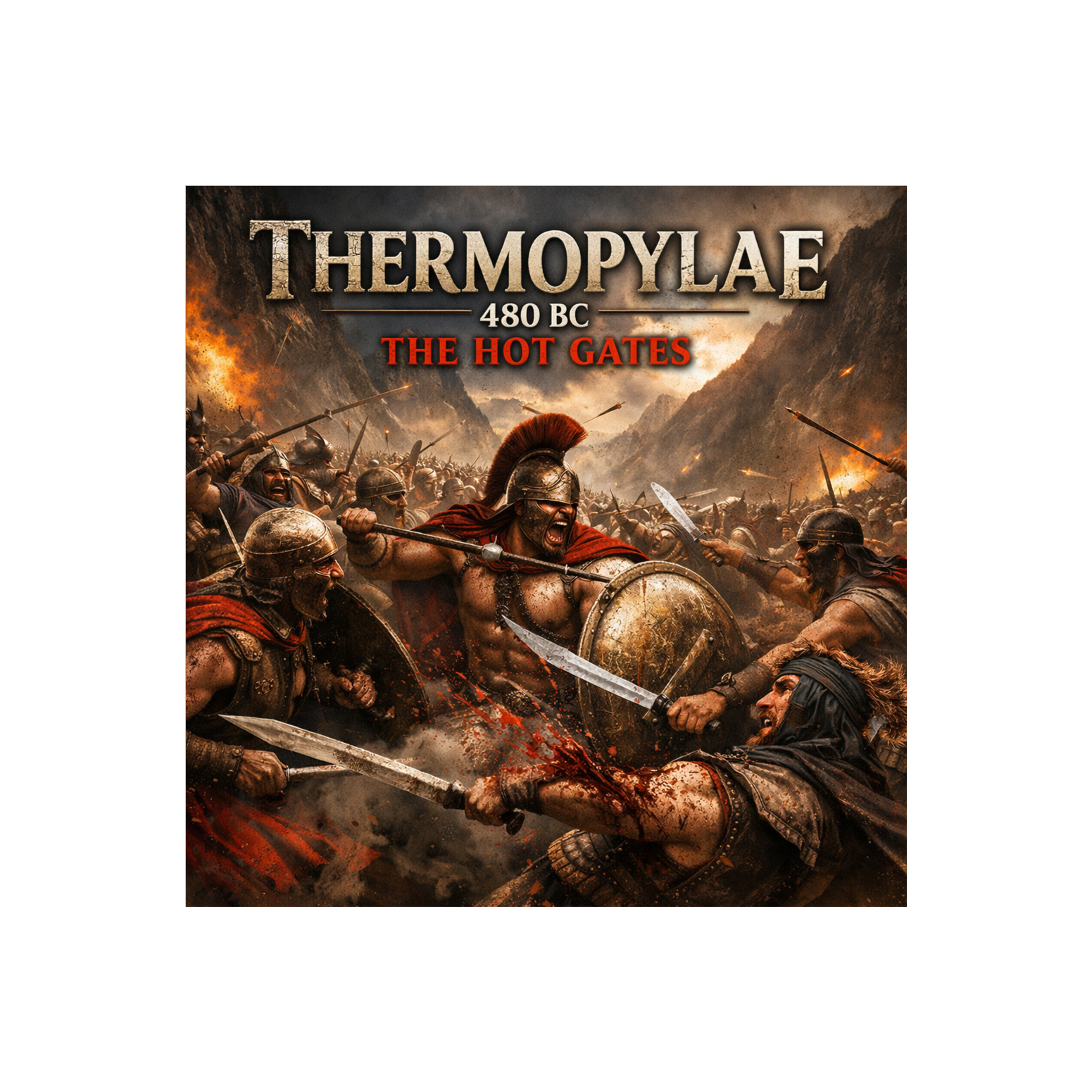 True heavy metal + epic power metal, 176 BPM, E minor, Drop D, Intro: distant war horns + low choir pad + slow tom hits like marching feet; then explode into fast galloping riffs and bright twin-lead harmonies, Verses: tight palm-mutes, driving double-kick, martial snare; bass pushing steady 8ths, Pre-chorus: rising chord tension with layered vocals and a climbing melody (harmonic minor lift), Chorus: massive heroic arena hook with gang shouts (“THERMOPYLAE!” “HOT GATES!” “HOLD!”), choir backing and wide guitars, Mid-song: heavy halftime “last stand” section (crushing chugs, tom-heavy), then snap back to full speed; melodic/neo-classical solo with harmonic minor runs, bends, harmonized ending, Vocals: commanding male tenor with gritty edge, documentary storytelling, occasional spoken lines, Lyrics historically grounded: Greek coalition holds narrow pass; Xerxes’ attacks incl, Immortals;