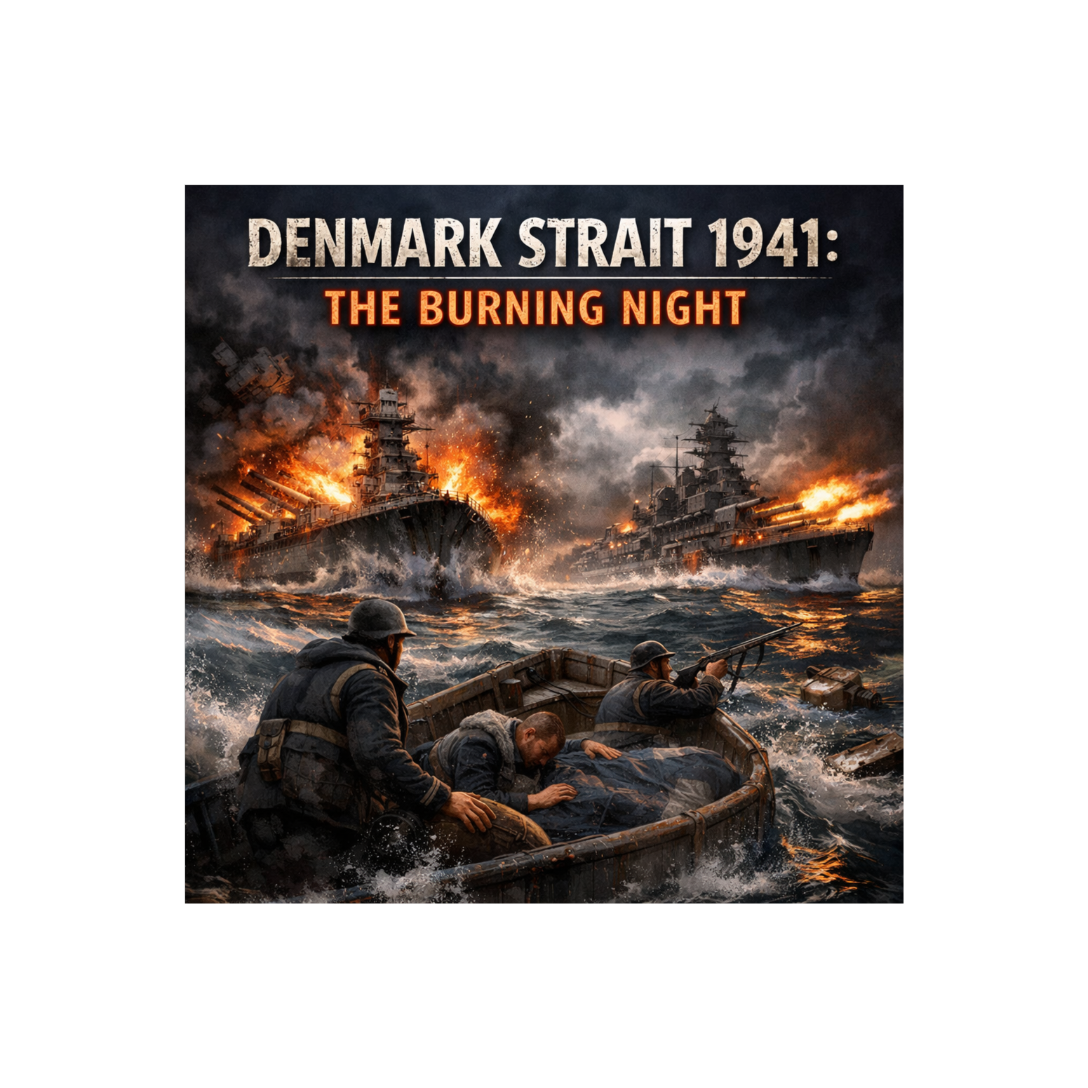 Modern naval heavy/power metal with stormfront drama, 182 BPM, F minor, Drop C#, Intro: cold wind pad, distant foghorn, then sharp gallop riff and mechanical palm-mutes, Verses: double-kick drive, snare like steel rivets; bass 8ths; timed stop-start hits as salvos, Pre-chorus: rising chords, tension like closing range in fog, Chorus: huge arena hook with gang shouts “DENMARK STRAIT!” “BATTLESHIPS!” “FIRE!”, subtle choir behind wide guitars, Bridge/halftime: crushing stomp for the fatal magazine blast; then snap back to full speed, Solo: melodic/harmonic minor run, bends, harmonized twin lead resolve, Vocals: commanding male tenor with grit, documentary clarity; no modern slang, Lyrics grounded: May 1941, Bismarck and P, Eugen meet Hood and Prince of Wales; gunnery exchange in poor visibility; Hood explodes and sinks; Bismarck damaged and later hunted, Add spoken callouts, sonar FX