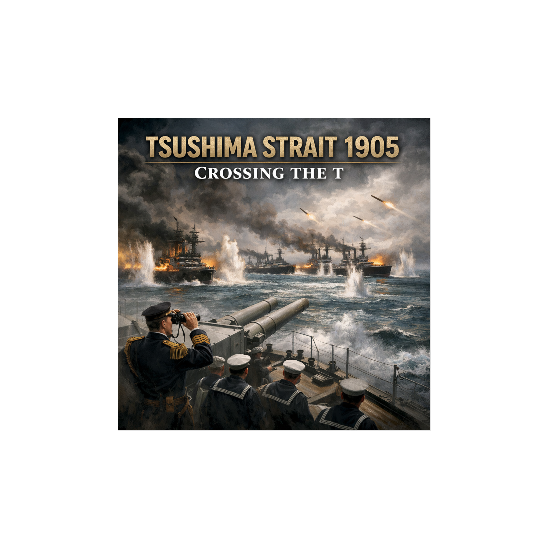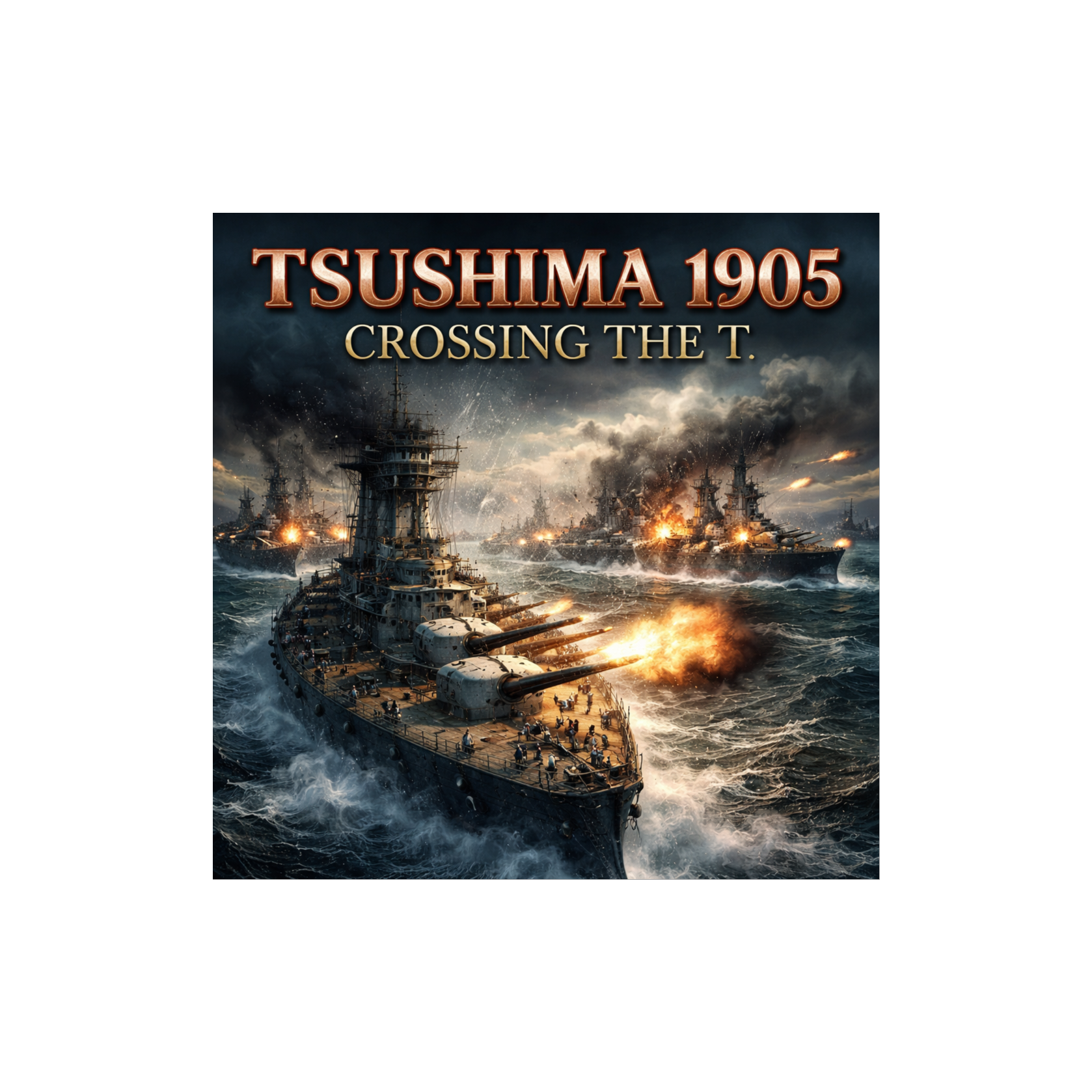 Modern naval power metal with steel-and-smoke precision, 180 BPM, E minor, Drop D, Intro: sonar-like low pad + distant “gun” tom hits, then fast galloping riffs and mechanical palm-mutes, Verses: relentless double-kick, crisp snare; bass driving 8ths; stop-start hits like timed salvos and course corrections, Pre-chorus climbs with layered vocals and rising harmony, Chorus: huge arena hook with gang shouts (“TSUSHIMA!” “CROSSING THE T!”), subtle choir backing and harmonized leads, Mid-song: halftime crushing section for concentrated fire, then surge back to full speed; melodic/neo-classical solo, Vocals: commanding tenor with grit, documentary tone, Lyrics grounded: May 1905, fleet meets in strait; maneuver to gain firing advantage; concentrated gunnery; decisive defeat and surrender/flight