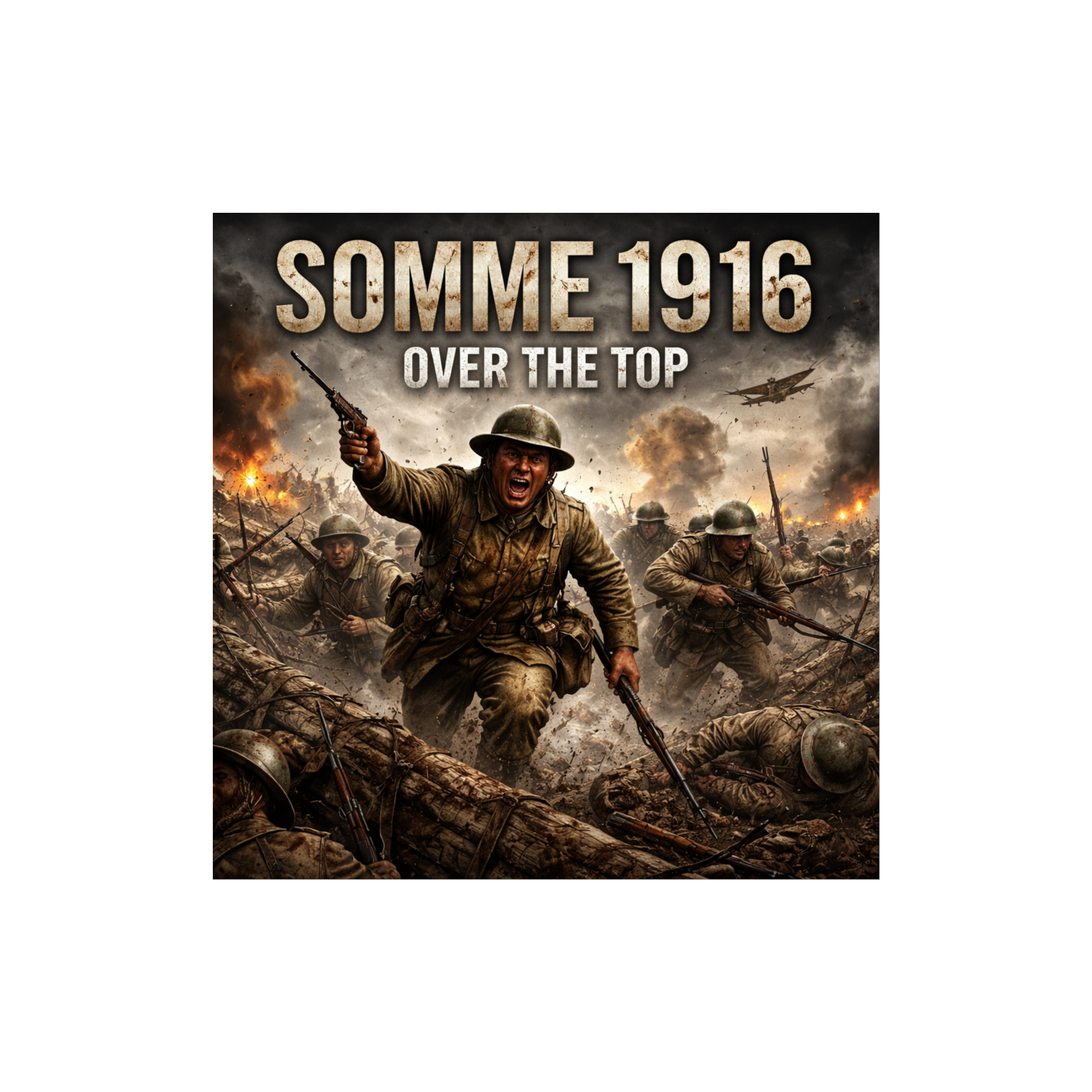 Dark epic heavy metal fused with power metal and trench-doom weight, 162 BPM, D minor, Drop C#, Intro: distant artillery booms (kick/toms) + marching snare rolls, low choir pad, then slam into tight palm-muted chugs with occasional gallop riffs, Verses: relentless double-kick bursts, crisp snare, bass driving 8ths; add stop-start “shell impact” hits and short 1-beat dropouts, Pre-chorus rises with climbing chords and layered vocals, tension like whistles before going “over the top, ” Chorus: huge mournful arena hook with gang shouts (“SOMME!” “OVER THE TOP!”), choir backing and harmonized twin leads, Mid-song: halftime crushing section for no-man’s-land and wire, then snap back to full speed; melodic/neo-classical solo with harmonic minor touches and harmonized resolve, Vocals: expressive male tenor with gritty edge, clear storytelling, occasional spoken lines, Lyrics grounded: July–Nov 1916