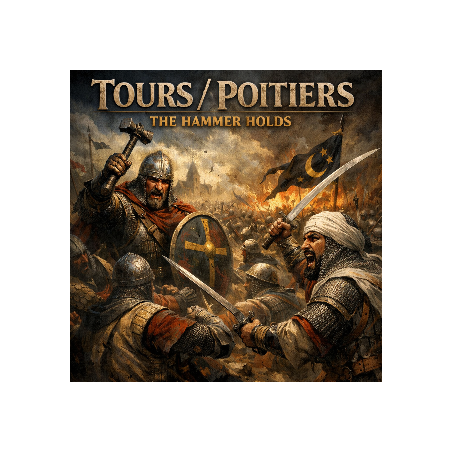 Epic true heavy metal with power metal chorus, 162 BPM, A minor, Standard tuning (or Drop D for heavier chugs), Intro with distant war horns/low choir pad, then classic galloping riffs and ringing open-string hooks, Verses: tight palm-muted rhythm, steady double-kick bursts and martial snare; bass driving eighths, Pre-chorus: rising chord tension, layered vocals, tom build, Chorus: massive anthemic hook with gang shouts (“HAMMER!” “TOURS!” “POITIERS!”), choir backing, bright twin-lead harmonies, Mid-song: halftime stomp to depict cavalry waves breaking, then fast build into melodic/neo-classical solo (harmonic minor touches, bends, harmonized ending), Vocals: heroic baritone/tenor with gritty edge, commanding storytelling; occasional spoken lines and battle calls, Lyrics historically grounded: Frankish infantry under Charles Martel holds a disciplined line on higher ground