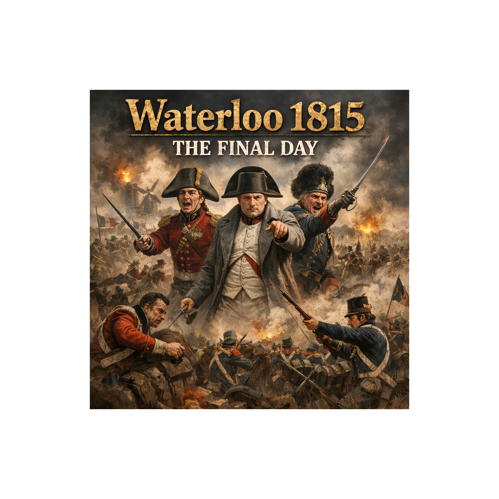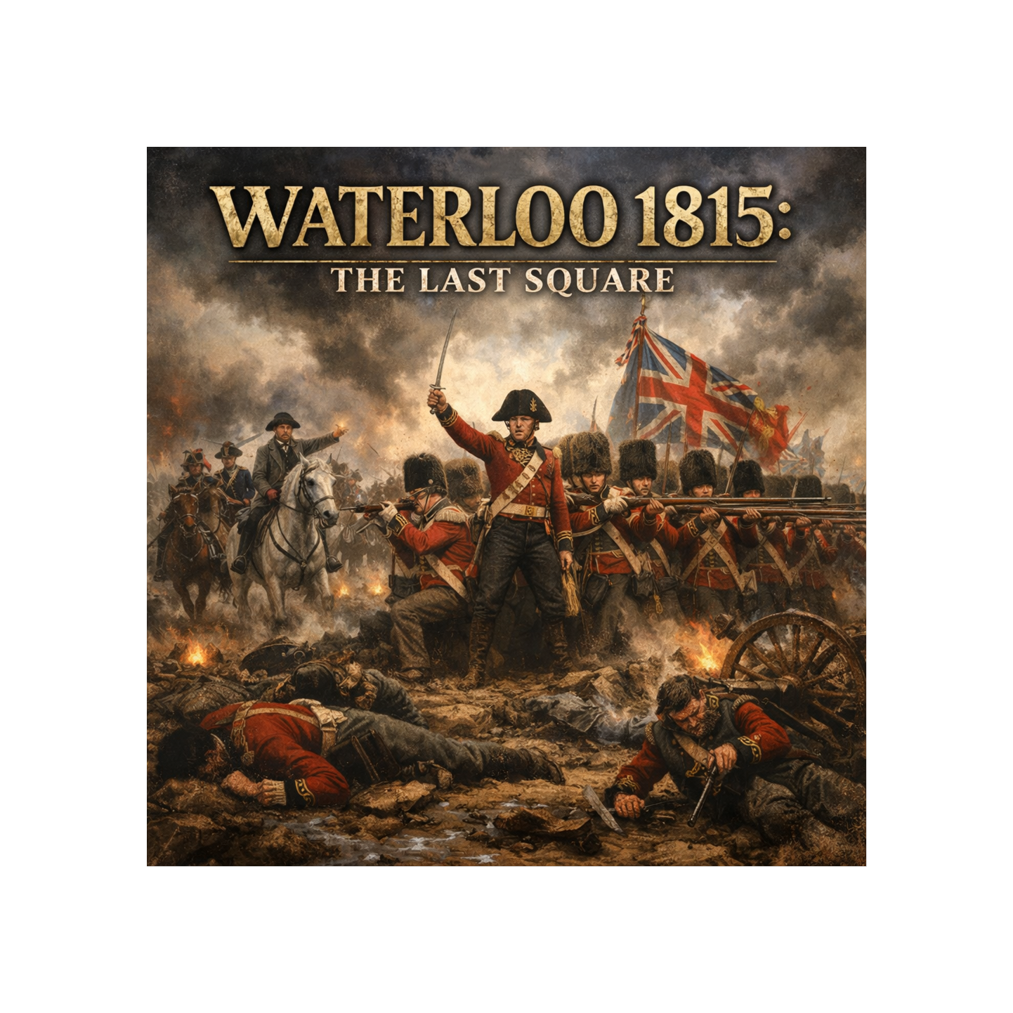 Epic true heavy metal fused with power metal, 176 BPM, C minor, Drop D, Intro with distant cannon-like drum hits + low choir pad + war-horn guitar swells, then fast galloping riffs and sharp palm-muted chugs, Verses: relentless double-kick, martial snare rolls, bass driving eighths; brief stop-start hits to mimic artillery shocks, Pre-chorus rises with climbing chords and layered vocals, Chorus: massive arena hook with gang shouts (“WATERLOO!” “HOLD!” “SQUARES!”), choir backing and bright harmonized twin-leads, Mid-song: heavy halftime stomp for “Imperial Guard” approach, then snap back to full speed; melodic/neo-classical solo with harmonic minor touches, bends, harmonized ending, Vocals: commanding male tenor with gritty edge, clear storytelling, occasional spoken lines and shouted commands, Lyrics historically grounded: 18 June 1815, Wellington’s defense (Hougoumont, La Haye Sainte)