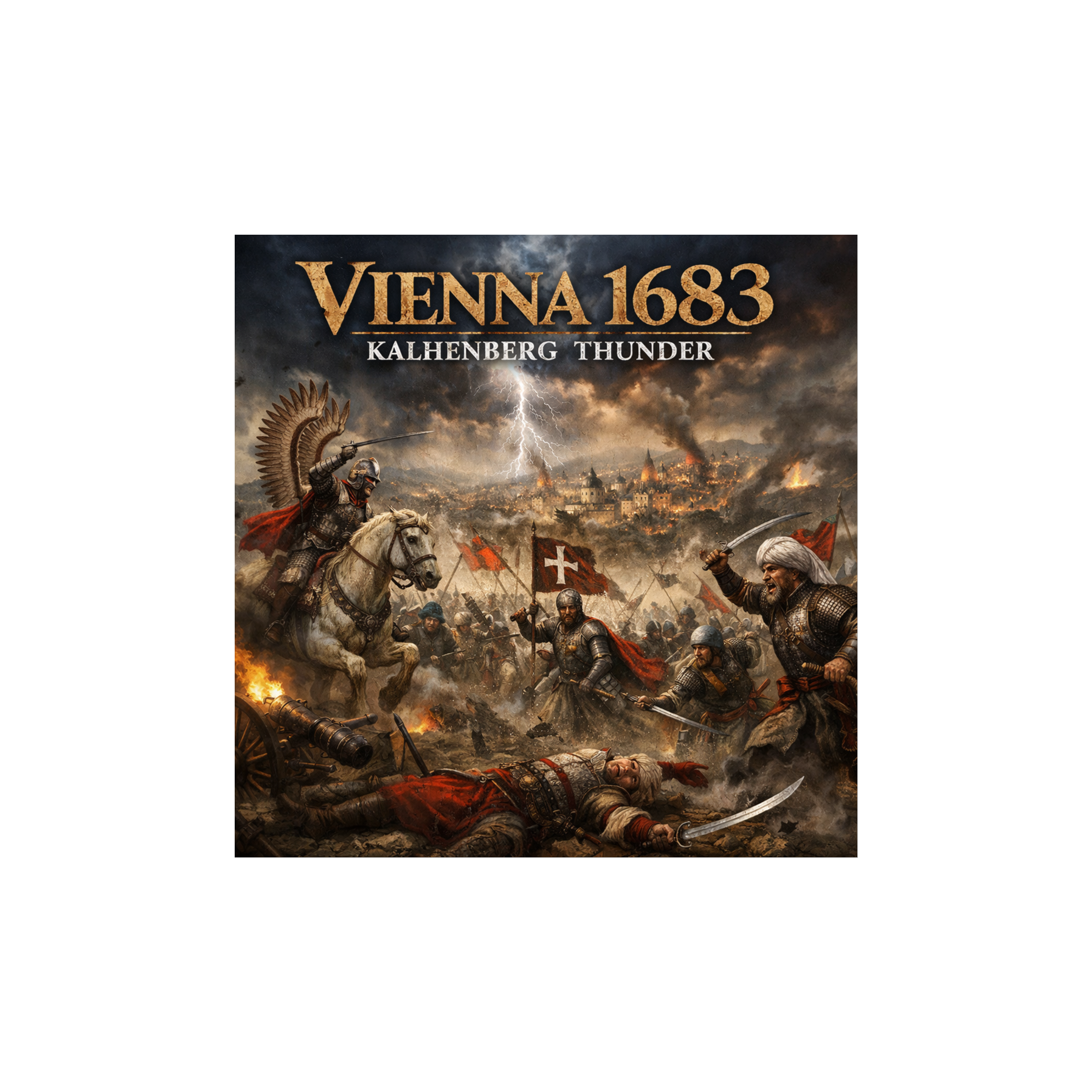 Epic power metal with true heavy punch, 176 BPM, G minor, Drop D, Intro: ominous choir pad + distant war horns + low tremolo guitar, evoking siege tension; then explode into fast galloping riffs and bright twin-lead harmonies, Verses: tight palm-mutes, relentless double-kick, martial snare and tom fills; bass driving eighths, Pre-chorus: rising chord progression with layered vocals, building anticipation for the charge, Chorus: massive triumphant arena hook with gang shouts (“VIENNA!” “KALHENBERG!” “HUSSARS!”), choir backing and harmonized leads, Mid-song: halftime stomp to portray the siege’s weight and the final rally, then rapid acceleration into a melodic/neo-classical solo (harmonic minor touches, fast runs, bends, harmonized ending), Vocals: heroic male tenor with gritty edge, commanding storytelling; occasional spoken lines and shouted battle calls, Lyrics historically grounded: Ottoman