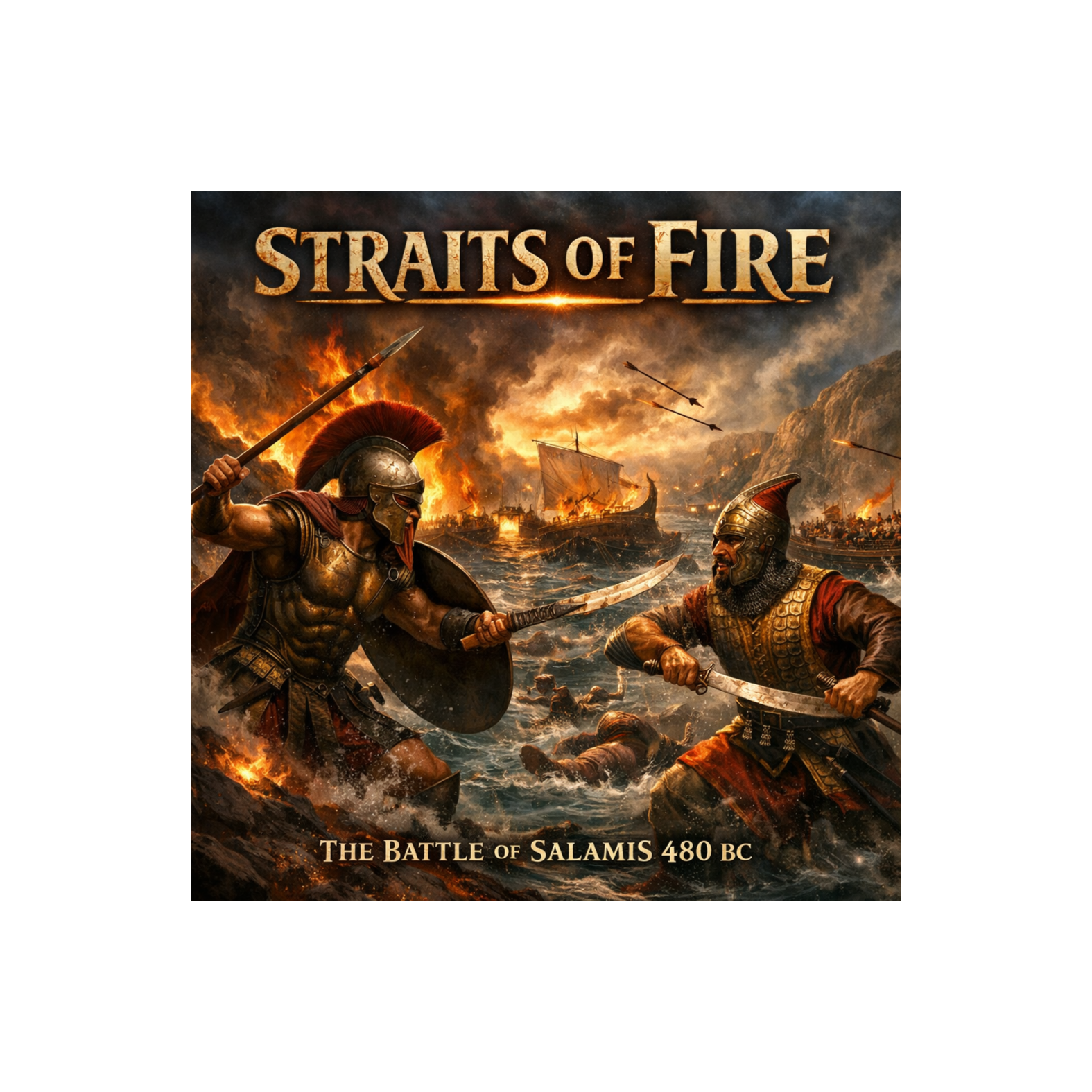 Epic heavy/power metal with ancient naval-war intensity, 178 BPM, E minor, Drop D, Intro: sea-wind ambience + low choir pad + war-horn guitar motif, then explode into fast galloping riffs and tight palm-muted chugs, Verses: relentless double-kick, crisp snare; bass driving 8ths; add stop-start “ram impact” hits and short drum breaks like oars striking water, Pre-chorus rises with layered vocals and climbing harmony, Chorus: huge arena hook with gang shouts (“SALAMIS!” “NARROW STRAITS!” “FIRE!”), choir backing and harmonized twin leads, Mid-song: halftime crushing section for the crush in the channel, then snap back to full speed; melodic/neo-classical solo with harmonic minor runs and harmonized ending, Vocals: commanding male tenor with gritty edge, documentary storytelling, no modern slang, Lyrics grounded: Persian fleet lured into narrow waters; Greek triremes exploit space; chaos, collision
