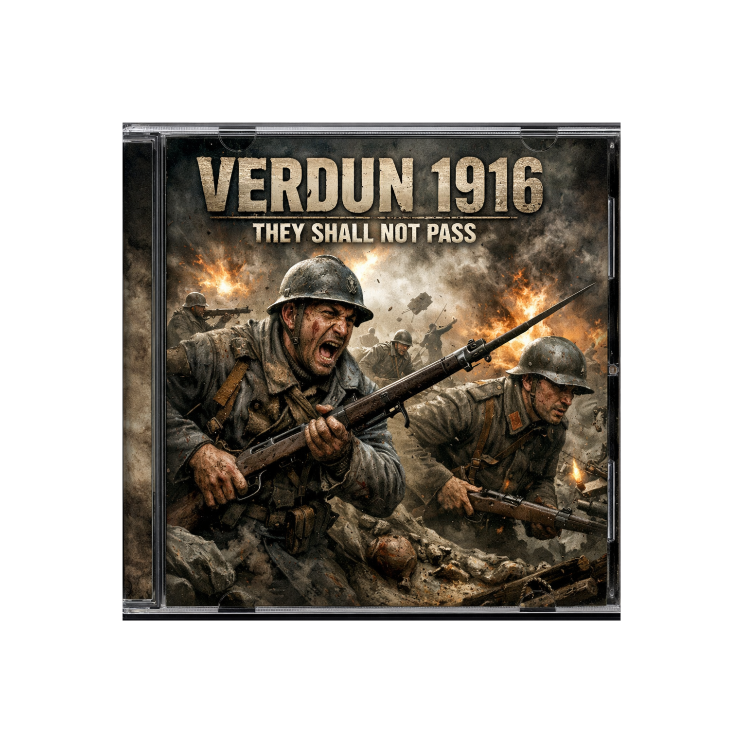 Dark epic heavy metal fused with power metal, 150 BPM, F minor, Drop C, Cinematic war-march vibe: crushing mid-tempo stomp riffs + occasional gallop bursts, tight palm-mutes, heavy low-mids, Drums: punchy kick, marching snare rolls, tom-heavy halftime bridge; brief stop-hit “artillery impact” moments, Bass: gritty, audible, driving 8ths, Guitars: thick rhythm wall; add tremolo-picked melodic line in one verse for “shrapnel wind, ” Chorus must be huge, mournful, anthem-like with choir pad + gang shouts, repeat hook often: “THEY SHALL NOT PASS — VERDUN!” (optionally 1–2 French shouts “Ils ne passeront pas!”), Structure: intro ambience (distant artillery/rain) → verse → rising pre-chorus → massive chorus → verse → chorus → halftime doom bridge referencing Voie Sacrée (endless trucks/rotation) → melodic/neo-classical solo (harmonic minor) → breakdown chant naming Meuse/Douaumont/Vaux → extended fina