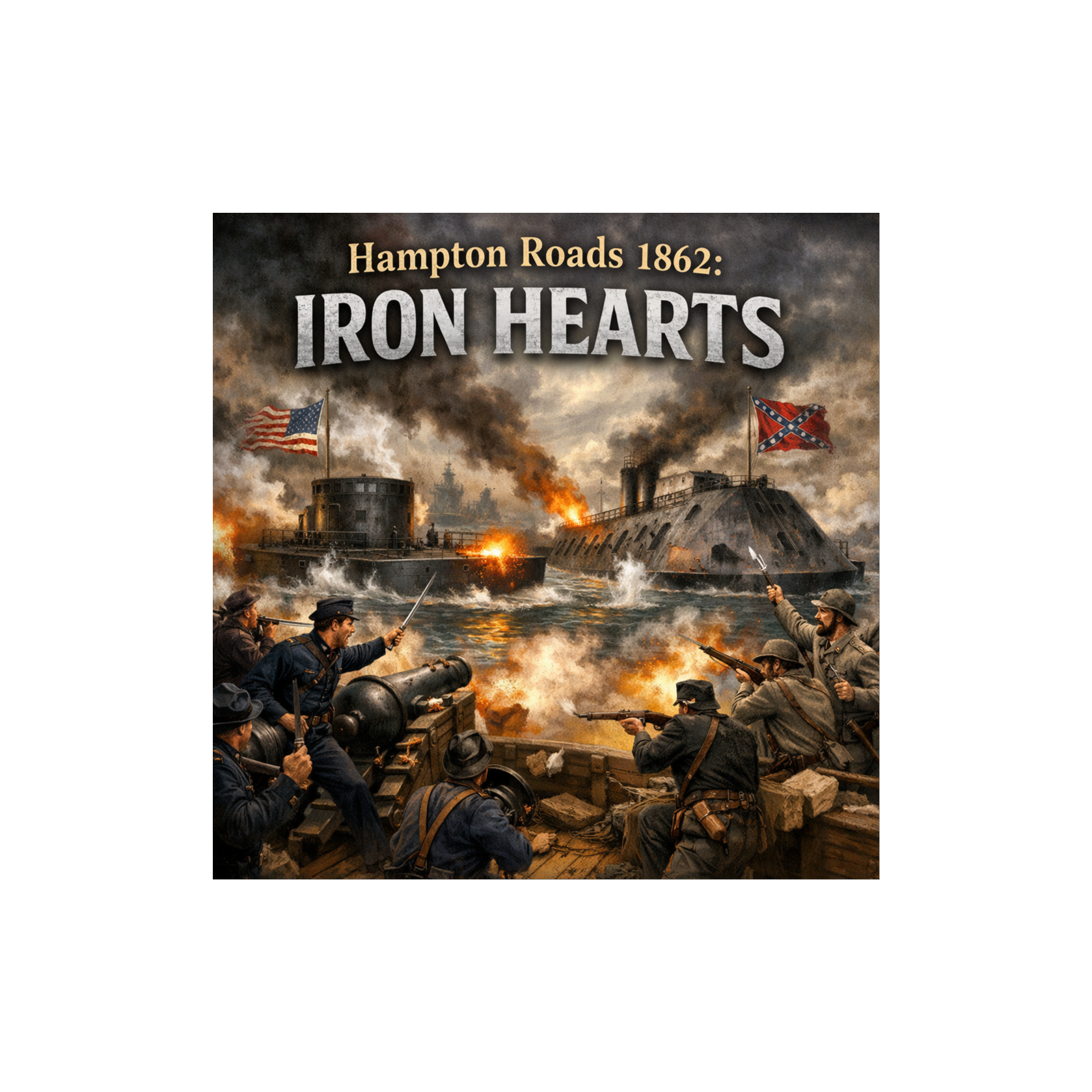 Industrial-era naval heavy/power metal with cinematic dread, 176 BPM, E minor, Drop D, Intro: sonar-like low pad, shipyard hammer hits on toms, then galloping riff, Verses: tight palm-muted chugs, double-kick drive, snare like rivets; bass 8ths; stop-start accents as cannon blasts, Pre-chorus: rising chords, tension like smoke over the Roads, Chorus: huge arena hook with gang shouts “HAMPTON ROADS!” “IRONCLADS!” “NO MORE WOOD!”, subtle choir behind wide guitars, Bridge/halftime: crushing stomp for the first armored duel; lyrics: 1862, CSS Virginia (ex-Merrimack) vs USS Monitor, revolving turret, armor vs shot, stalemate, end of wooden era, Solo: melodic/harmonic minor run then harmonized twin lead, Vocals: clear heroic tenor with gritty edge, documentary tone; no modern slang, Add spoken logbook lines, sea-wind FX between sections brass stabs on downbeats, brief tempo dip for “ram and recoil”