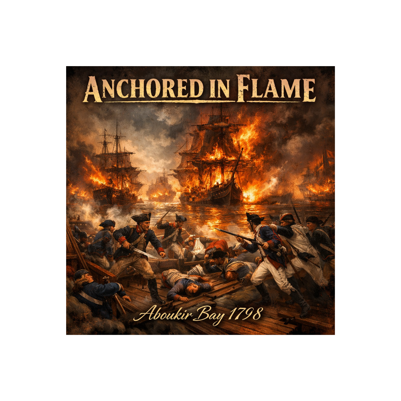 Classic heavy metal + power metal (age of sail) with cinematic cannon impact, 172 BPM, A minor, Standard/Drop D, Intro: sea-wind clean guitars + distant drums + low choir pad, then galloping riffs with bright harmonized leads, Verses: tight palm-muted chugs, double-kick bursts; big “broadside” accents (toms/kick) and stop-start hits like salvo timing, Pre-chorus builds tension with rising chords and layered vocals, Chorus: huge arena hook with gang shouts (“THE NILE!” “ABOUKIR!” “ANCHORED IN FLAME!”), choir pad subtle, Mid-song: halftime crushing “close-in along the line” section, then surge to melodic/neo-classical solo, Vocals: heroic tenor with grit, documentary delivery, Lyrics grounded: French fleet anchored in bay; British attack at dusk/night; ships engaged from multiple angles; flagship explosion as dramatic turning point; decisive victory