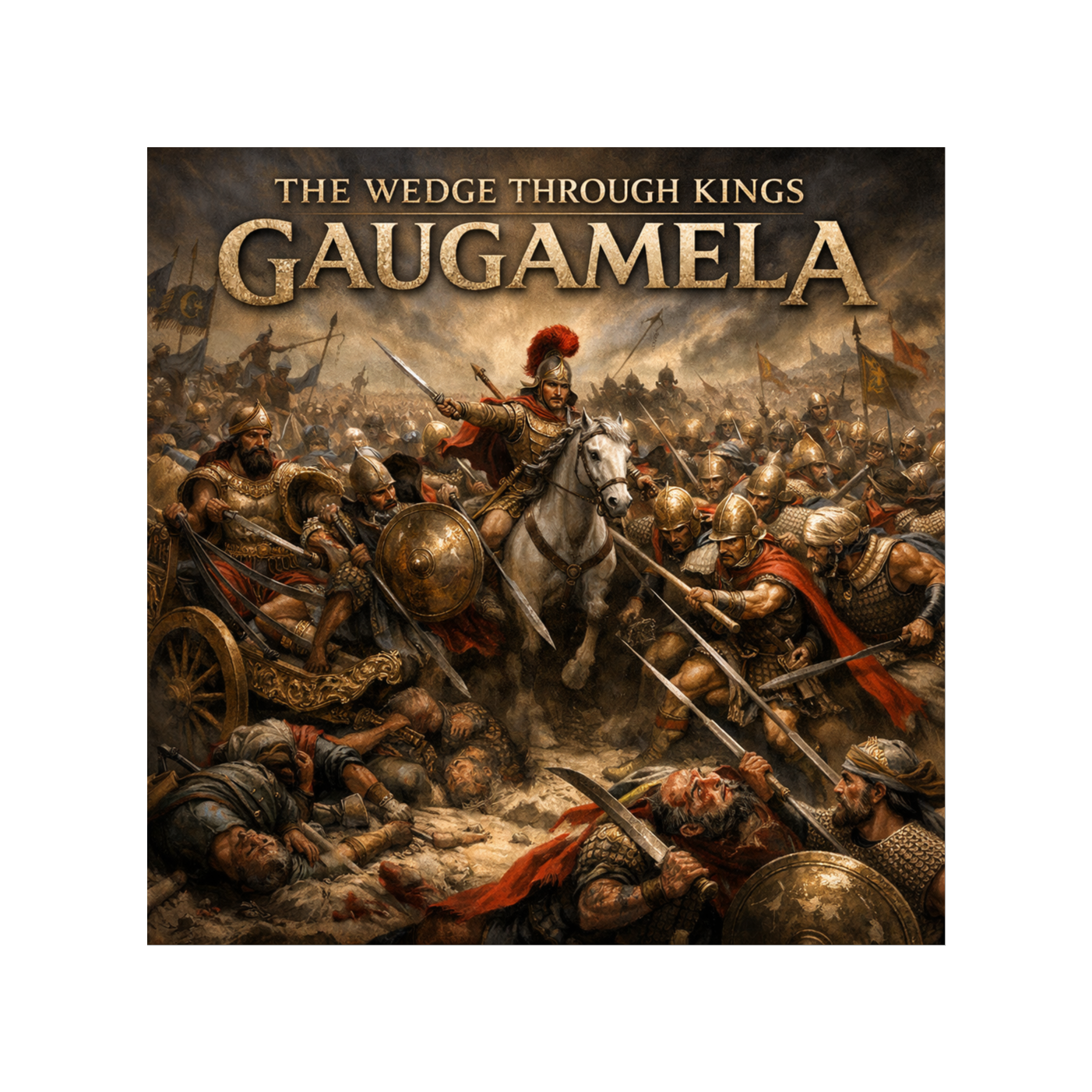 Epic power metal with true heavy bite, 182 BPM, F# minor, Drop D, Intro: war-horn lead + low choir pad, then fast galloping riffs with bright twin-lead harmonies, Verses: tight palm-mutes, relentless double-kick, bass 8ths; add quick staccato breaks like chariot rushes and cavalry feints, Pre-chorus rises with climbing chords and layered vocals, Chorus: massive arena hook with gang shouts (“GAUGAMELA!” “THE WEDGE!”), choir backing and wide harmonized guitars, Mid-song: halftime “storm of cavalry” section, then snap back to full speed; melodic/neo-classical solo with harmonic minor runs, bends, harmonized ending, Vocals: heroic male tenor with gritty edge, story-driven, no modern slang, Lyrics grounded: prepared field, Persian numbers/line, Macedonian oblique movement, wedge into center gap, flight of king, battle turns