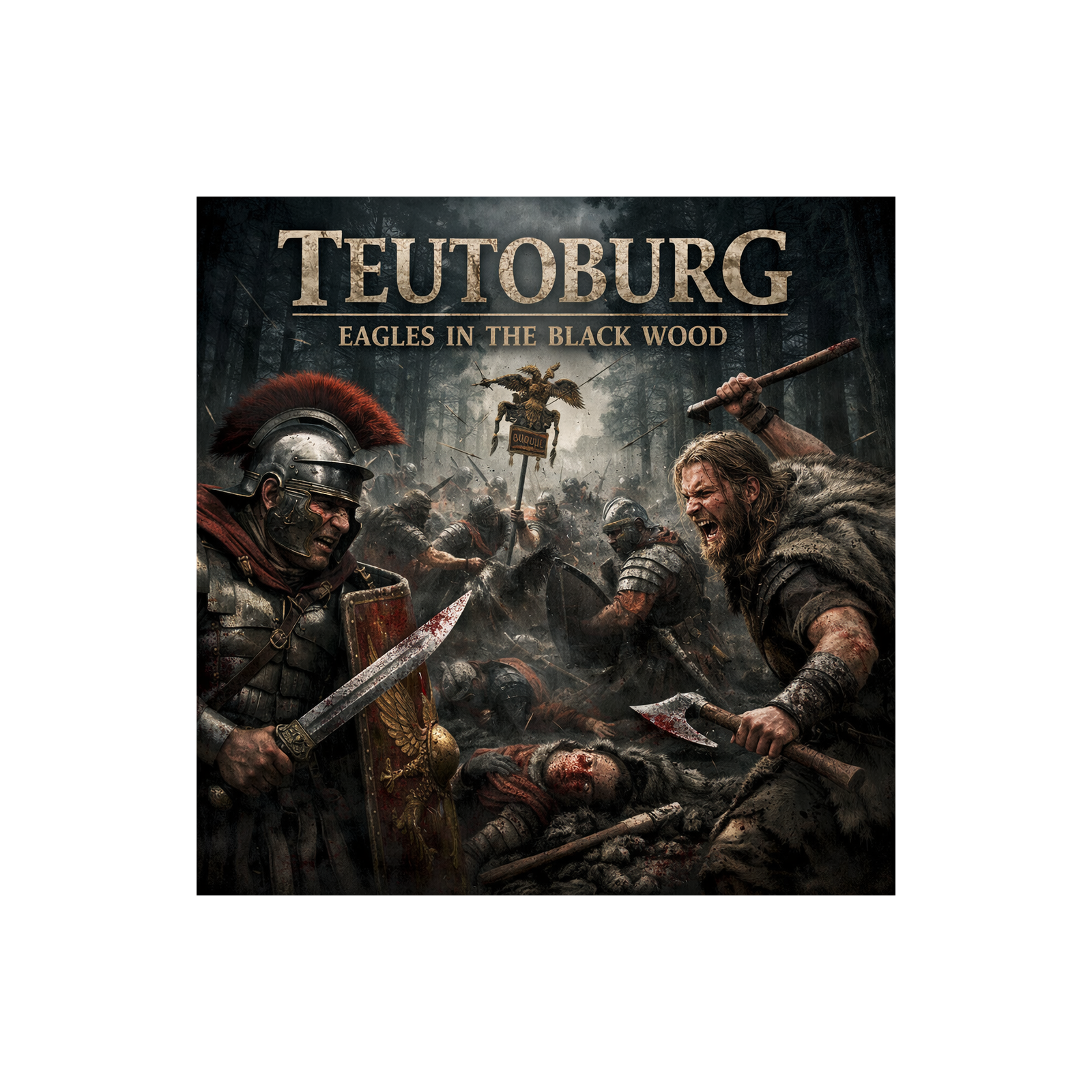 Dark true metal fused with epic power metal, 168 BPM, F# minor, Drop C# (or Drop D for tighter attack), Atmospheric intro: rain/forest ambience implied by clean guitar drones + low choir pad, then crash into tremolo-picked melodic theme over stomping mid-tempo riffs, Verses: tense, stalking rhythm with sudden double-kick bursts; pre-chorus rises with layered vocals and cold harmony leads, Chorus: towering mournful anthem with gang chants (“TEUTOBURG!” “VARUS!” “EAGLES!”), choir backing and wide harmonized guitars, Mid-song: slow, crushing halftime section to depict the trap closing, then rapid acceleration into a melodic/neo-classical solo (harmonic minor flavor, fast runs, bends, harmonized ending), Vocals: dramatic male tenor with gritty sustain; occasional whispered spoken lines for dread, Lyrics historically grounded: 9 AD, Varus leads Legions XVII, XVIII, XIX in march column with wagons;