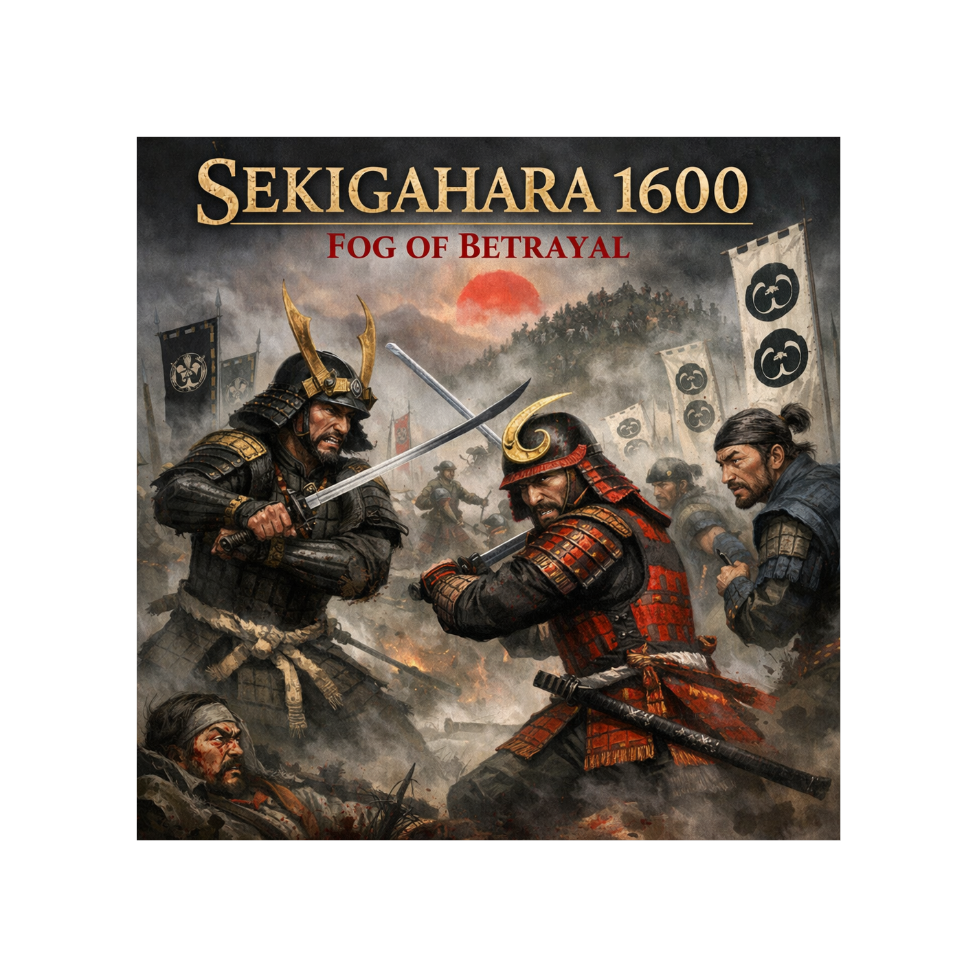 Epic heavy/power metal with subtle Japanese battlefield color, 176 BPM, D minor, Drop D, Intro: distant taiko-like tom pattern + low choir pad + brief clean guitar motif with pentatonic/koto-like phrasing, then explode into fast galloping riffs and bright twin-lead harmonies, Verses: tight palm-muted chugs, relentless double-kick, crisp snare; bass driving steady 8ths, Pre-chorus builds with rising chords and layered vocals, tension like fog lifting, Chorus: huge arena hook with gang shouts (“SEKIGAHARA!” “FOG!” “BETRAYAL!”), choir backing and wide harmonized guitars, Mid-song: halftime crushing section for the standoff/uncertainty on the ridge, then snap back to full speed as the defection turns the field; melodic/neo-classical solo with harmonic minor runs, bends, harmonized ending, Vocals: heroic male tenor with gritty edge, documentary storytelling, occasional spoken war calls