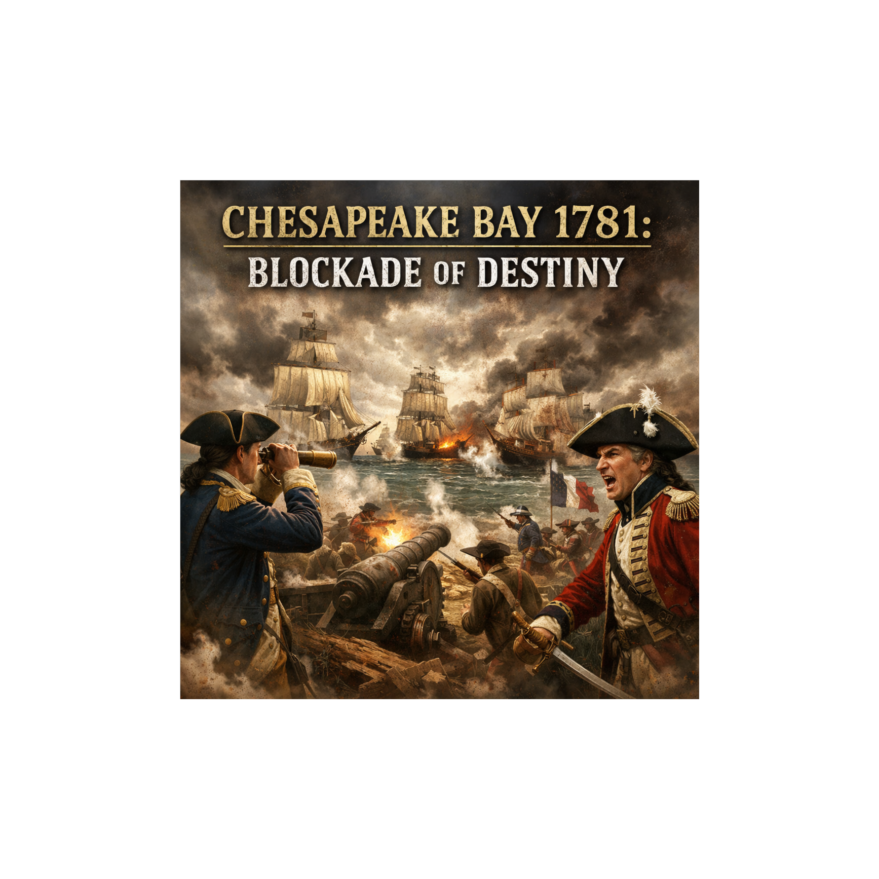 Classic heavy metal + power metal (age of sail) with relentless pursuit energy, 174 BPM, D minor, Standard/Drop D, Intro: sea-wind clean guitars + marching snare + low choir pad; then galloping riffs and bright harmonized leads, Verses: tight palm-muted chugs, double-kick bursts; huge “broadside” accents and stop-start breaks like signal calls, Pre-chorus builds with climbing chords, Chorus: massive arena hook with gang shouts (“CHESAPEAKE!” “BLOCKADE!” “NO ESCAPE!”), choir subtle, Mid-song: halftime crushing section for close-range exchanges and the closing net, then surge back; melodic/neo-classical solo, Vocals: heroic tenor with grit, documentary storytelling, Lyrics grounded: late 1781 naval battle in bay approaches; fleet forced away; blockade holds; outcome prevents relief/escape and seals fate ashore, No modern slang