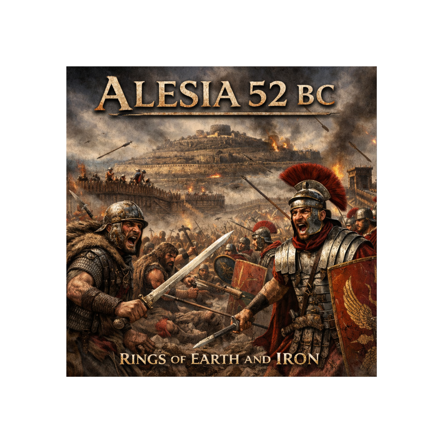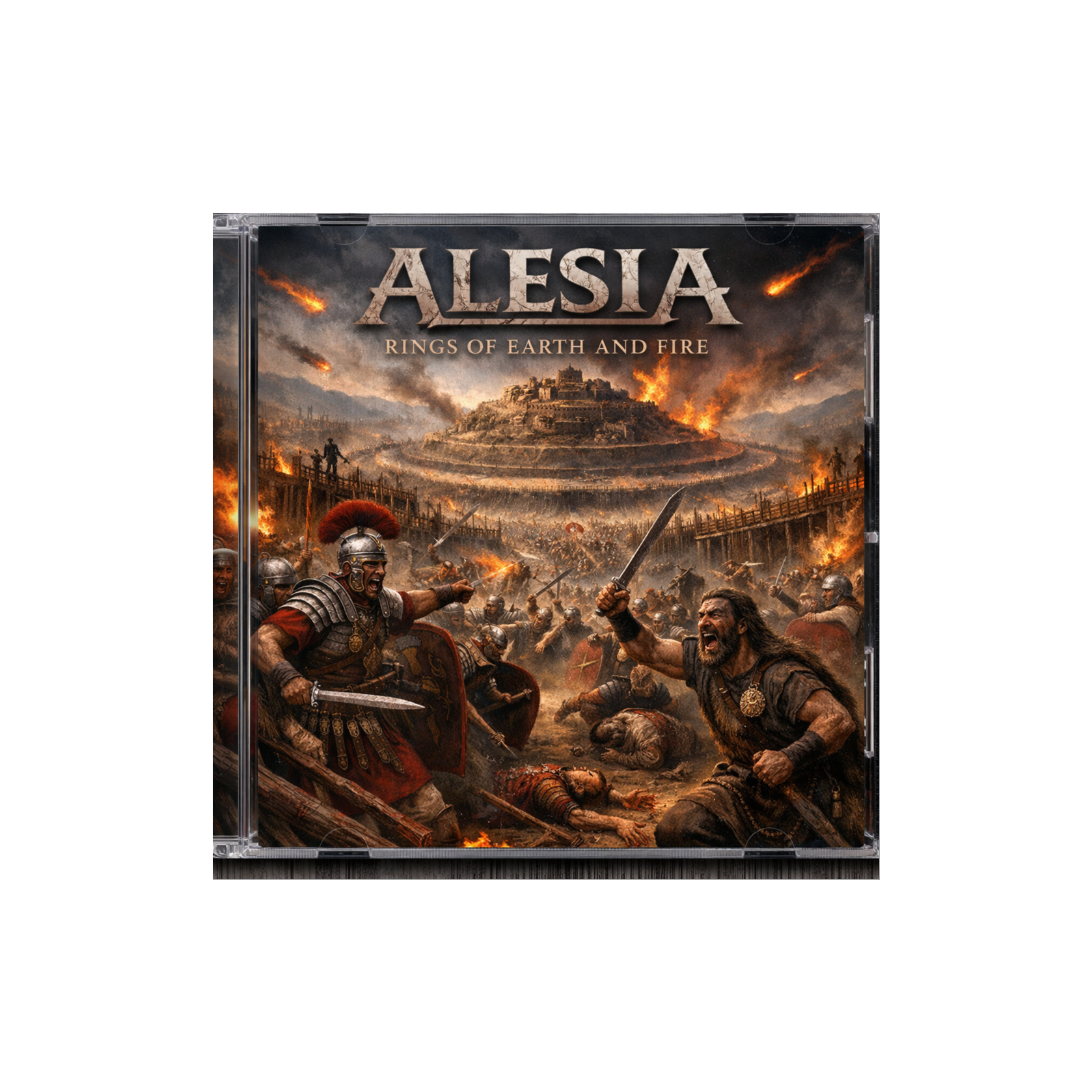 Epic heavy metal + power metal, 172 BPM, D minor, Drop D, Intro: distant horns + low choir pad + marching snare, then fast galloping riffs and tight palm-muted chugs, Verses: relentless double-kick, crisp snare, bass driving 8ths; add stop-start “assault” hits like volleys on ramparts, Pre-chorus climbs with rising chords and layered vocals, Chorus: huge ominous-heroic arena hook with gang shouts (“ALESIA!” “TWO RINGS!” “HOLD!”), choir backing and harmonized twin leads, Mid-song: halftime crushing “siege grind” section (toms like digging/ramming), then snap back to full speed; melodic/neo-classical solo with harmonic minor runs, bends, harmonized ending, Vocals: commanding male tenor with gritty edge, documentary storytelling; occasional spoken lines, Lyrics historically grounded: inner + outer fortifications, sorties from the hill, relief army attacks, Roman reserves counter, final surrender