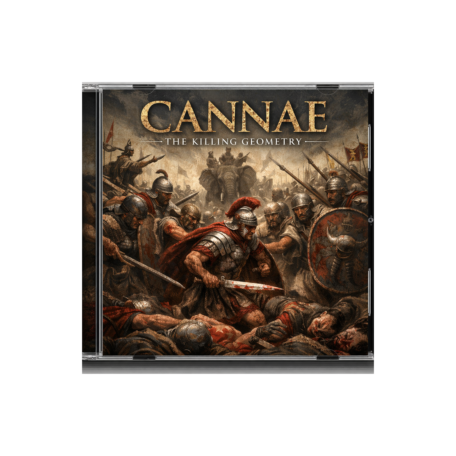 True heavy metal + epic power metal, 176 BPM, E minor, Drop D, Intro: low war-horn guitar swells + marching snare + distant “dust kick” toms, then explode into fast galloping riffs and tight palm-muted chugs, Verses: relentless double-kick, crisp snare, bass driving 8ths; add stop-start hits like shield impacts, Pre-chorus climbs with rising chords and layered vocals, Chorus: huge ominous arena hook with gang shouts (“CANNAE!” “DOUBLE ENVELOPMENT!”), choir pad behind and harmonized twin leads, Mid-song: halftime crushing section for the tightening ring, then snap back to full speed; melodic/neo-classical solo with harmonic minor runs, bends, harmonized ending, Vocals: commanding male tenor with gritty edge, documentary storytelling, occasional spoken battle calls, Lyrics historically grounded: Roman massed advance pushes center; Carthaginian center yields; wings hold and wrap;