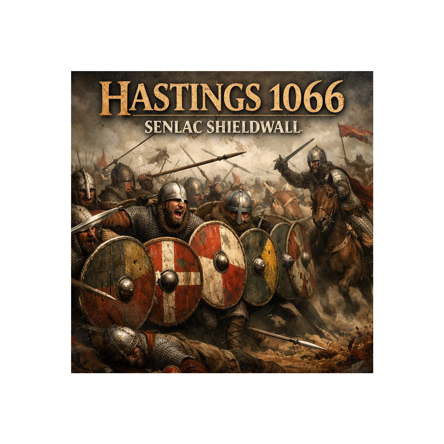 Epic heavy/power metal with medieval battle grit, 172 BPM, D minor, Drop D, Intro: war horns + low choir pad + marching snare, then fast galloping riffs with bright twin-lead harmonies, Verses: tight palm-muted chugs, double-kick drive, bass 8ths; add stop-start accents like axe-on-shield impacts, Pre-chorus rises with layered vocals and climbing melody, Chorus: huge arena hook with gang shouts (“HASTINGS!” “SHIELD WALL!”), choir backing and wide harmonized guitars, Mid-song: halftime crushing section for the grind on the ridge, then surge back to full speed; melodic/neo-classical solo with harmonic minor runs and harmonized ending, Vocals: heroic male tenor with gritty edge, documentary storytelling, Lyrics grounded: 14 Oct 1066; English shield wall on Senlac Hill; Norman assaults (archers, infantry, cavalry), feigned retreats drawing English out; wall breaks; Harold killed; Norman