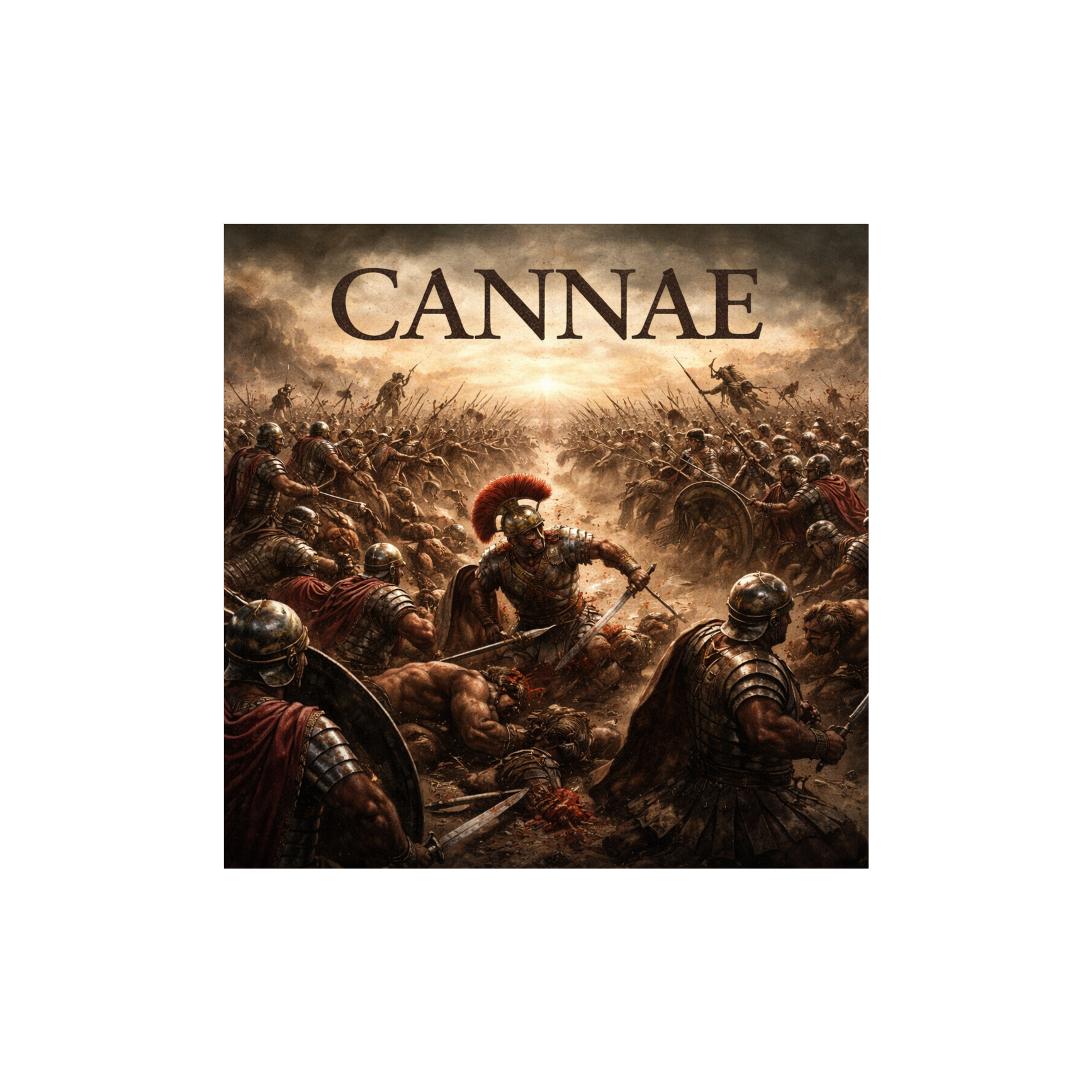 True heavy metal + speed/power metal, 184 BPM, D minor, Standard tuning (or Drop D for extra weight), Intro with distant war-drums and low horn-like guitars, then immediate razor gallops and tight triplet chugs, Verses: relentless double-kick, rigid palm-muted riffs, marching snare accents; bass audible driving eighths, Pre-chorus builds with rising chord tension and layered vocals, Chorus: huge, ominous-heroic anthem with gang shouts (“CANNAE!” “HANNIBAL!”), thick harmonized leads, choir pad behind the hook, Mid-song: tempo drop/half-time to depict encirclement closing, then explosive acceleration into a melodic/neo-classical solo with harmonic minor runs and harmonized endings, Vocals: gritty baritone-to-tenor, commanding storyteller, occasional spoken lines for dread and shouted cues for battle beats, Lyrics historically grounded: 216 BC, Apulia near the Aufidus, Roman consuls Varro/Paullus
