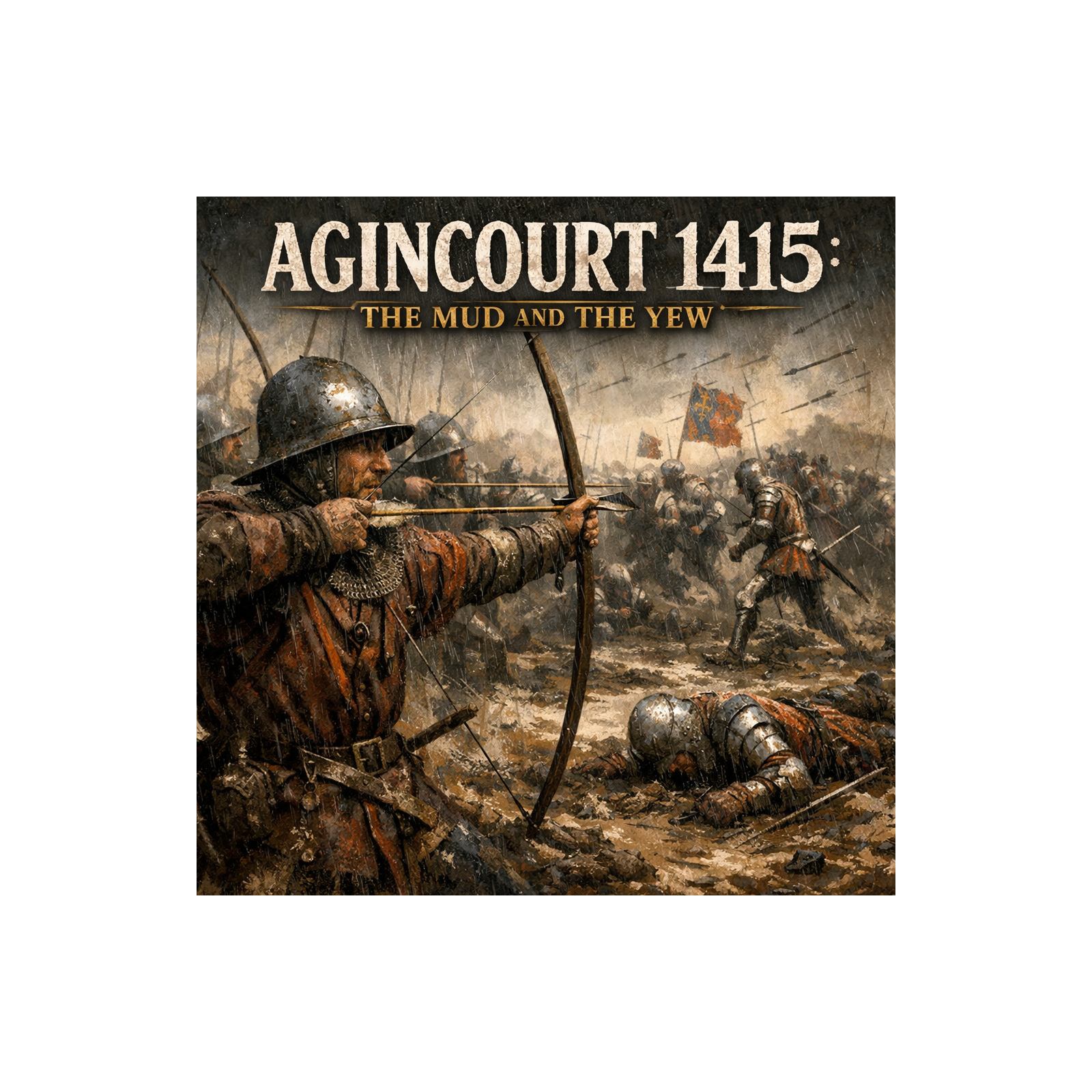 Epic power metal with true heavy edge, 178 BPM, E minor, Standard tuning (or Drop D for heavier chugs), Intro: brief clean/folk-tinged guitar (medieval flavor) + distant war-horns/low choir pad, then slam into galloping riffs with bright twin-lead harmonies, Verses: tight palm-muted rhythm, fast double-kick, martial snare rolls; bass driving eighths, Pre-chorus rises with climbing chords and layered vocals, Chorus: massive triumphant arena hook with gang shouts (“AGINCOURT!” “Yew!” “Hold!”) and choir backing, Mid-song: sudden halftime stomp to depict the French mass bogging down in mud, then snap back to full speed; add melodic/neo-classical solo with harmonic minor touches, bends, and harmonized ending, Vocals: heroic male tenor with gritty edge, commanding storytelling, occasional spoken lines and shouted calls, Lyrics historically grounded: 25 Oct 1415, Henry V’s outnumbered English force; l