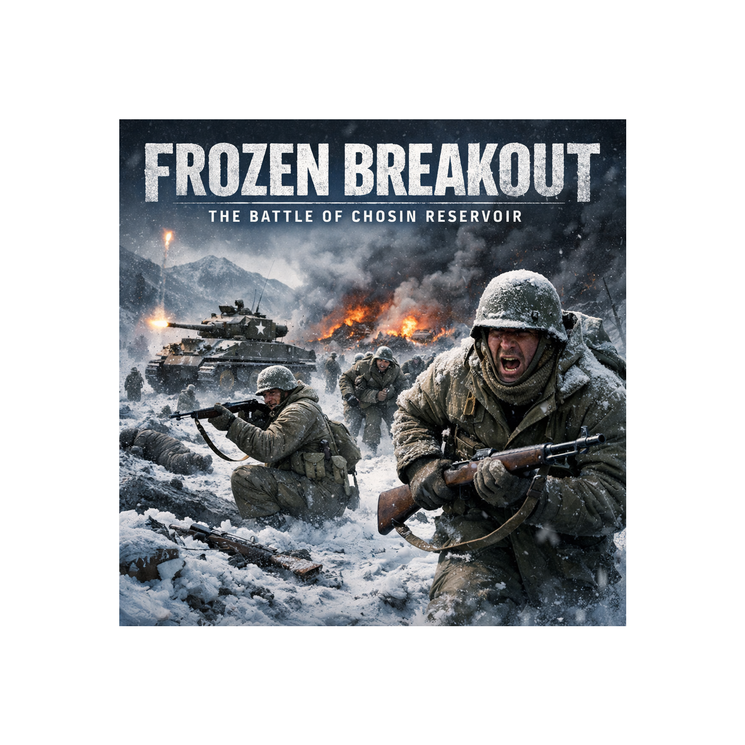 Dark epic heavy metal + power metal with winter intensity, 168 BPM, F minor, Drop C#, Intro: icy wind pad + low choir + slow tom hits, then tight chugs and urgent gallops, Verses: double-kick drive, crisp snare; bass 8ths; stop-start hits like ambushes, Pre-chorus rises with layered vocals, Chorus: huge grim arena hook with gang shouts (“CHOSIN!” “FROZEN BREAKOUT!”), choir backing and harmonized leads, Mid-song: halftime crushing section for subzero night attacks, then surge back to full speed; melodic solo with harmonic minor runs, Vocals: intense tenor with grit, documentary tone, Lyrics grounded: late Nov–Dec 1950, encirclement, extreme cold, break out to the coast, “frozen chosen” spirit, huge hardship, No modern slang, no gore-glorification